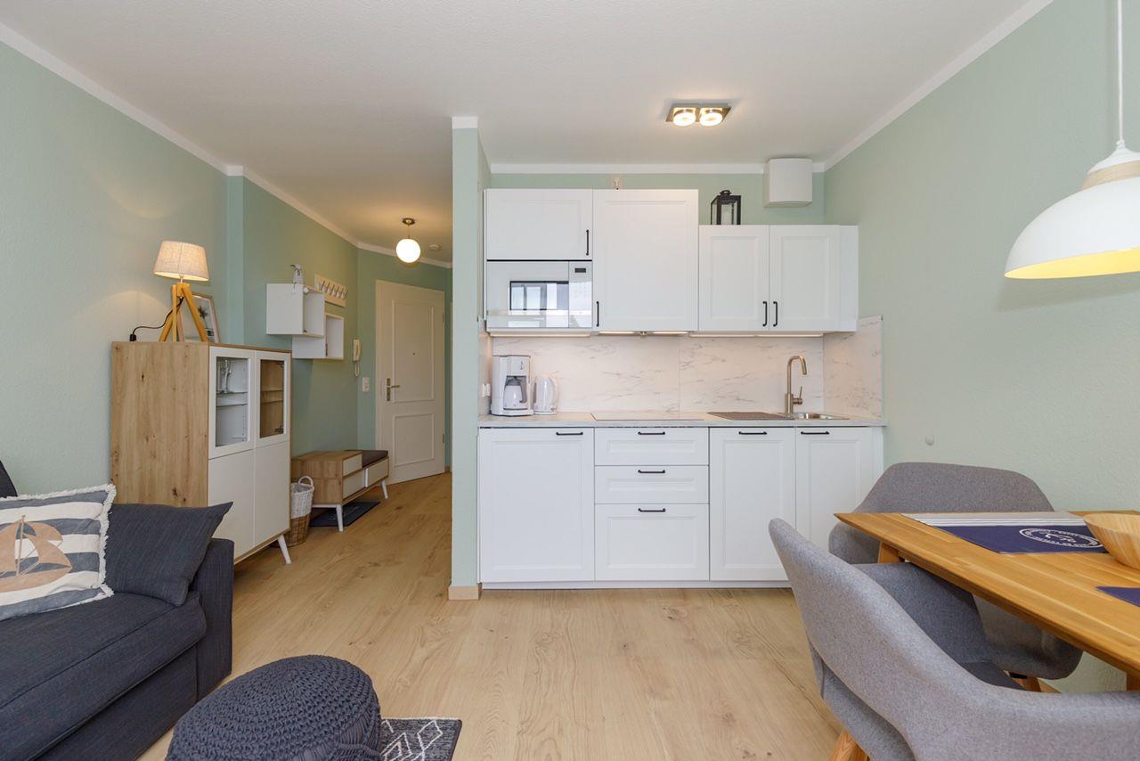 Die offene Küchenzeile ist modern ausgestattet und bietet einen Kühlschrank mit Gefrierfach, eine Mikrowelle mit Grillfunktion, einen Geschirrspüler, eine Kaffeemaschine und einen Wasserkocher – ideal für Selbstversorger.