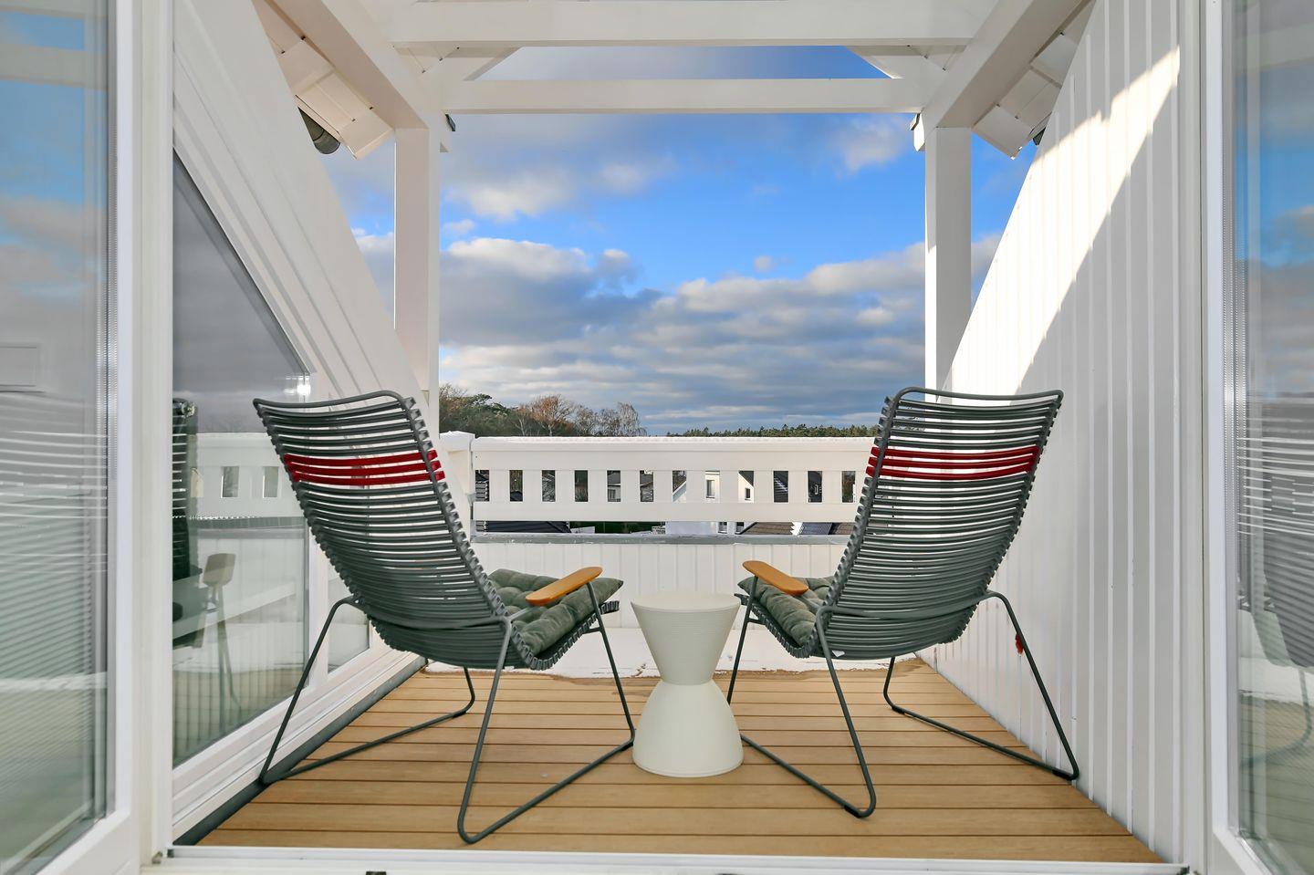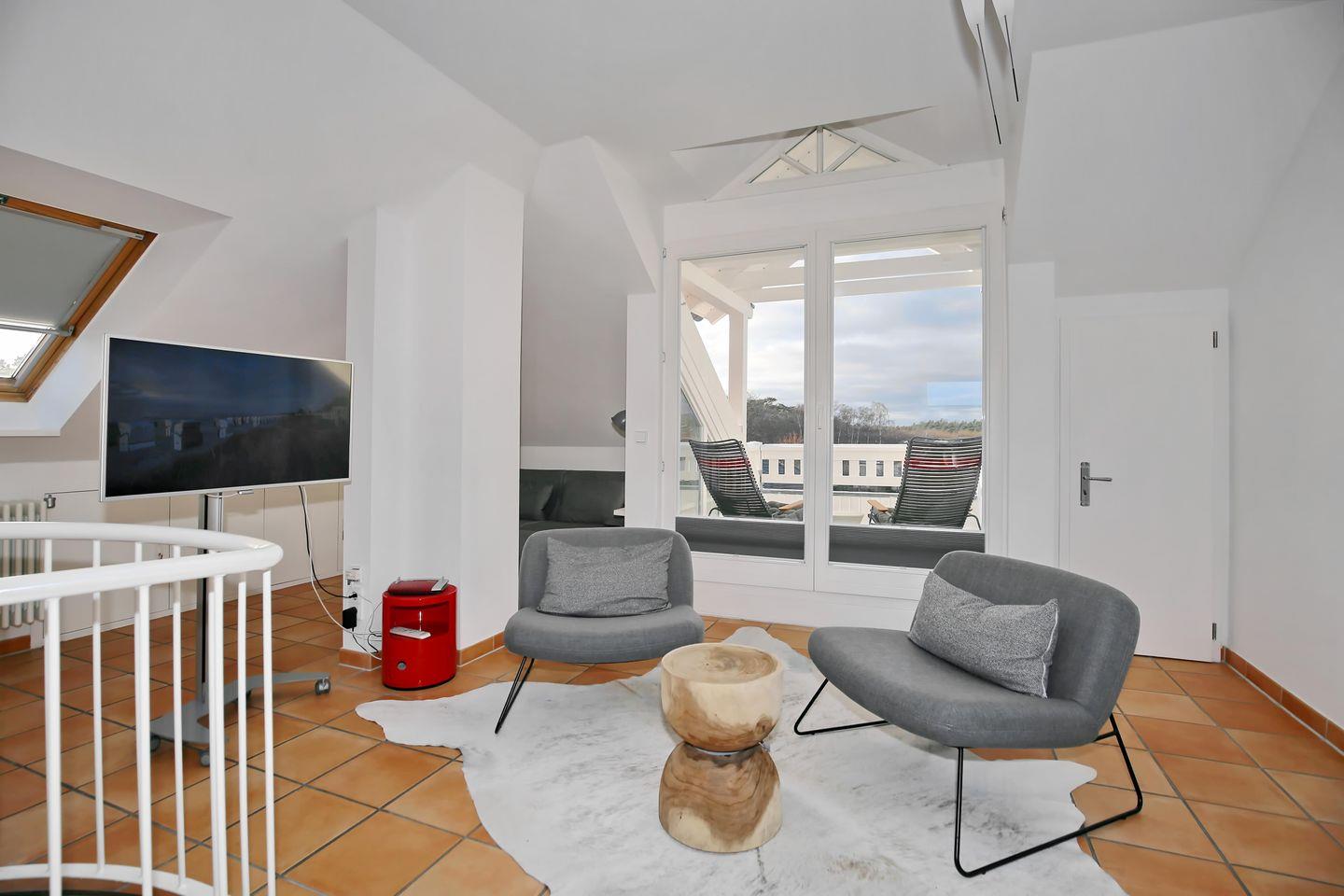 Die 62 m² große moderne Ferienwohnung liegt im 3. Obergeschoss und im Dachgeschoss der Ferienanlage. In der 2-Zimmer-Maisonette-Wohnung haben bis zu 2 Personen Platz. Auf zwei Etagen erwarten dich ein offener Wohn- und Schlafbereich, eine offene Küche mit Essbereich, eine Loggia, ein Duschbad und ein WC. Die Ferienwohnung liegt zentrumsnah und nur wenige Gehminuten vom Ortskern entfernt. Zum feinen Sandstrand und zur Seebrücke sind es etwa 800 Meter.