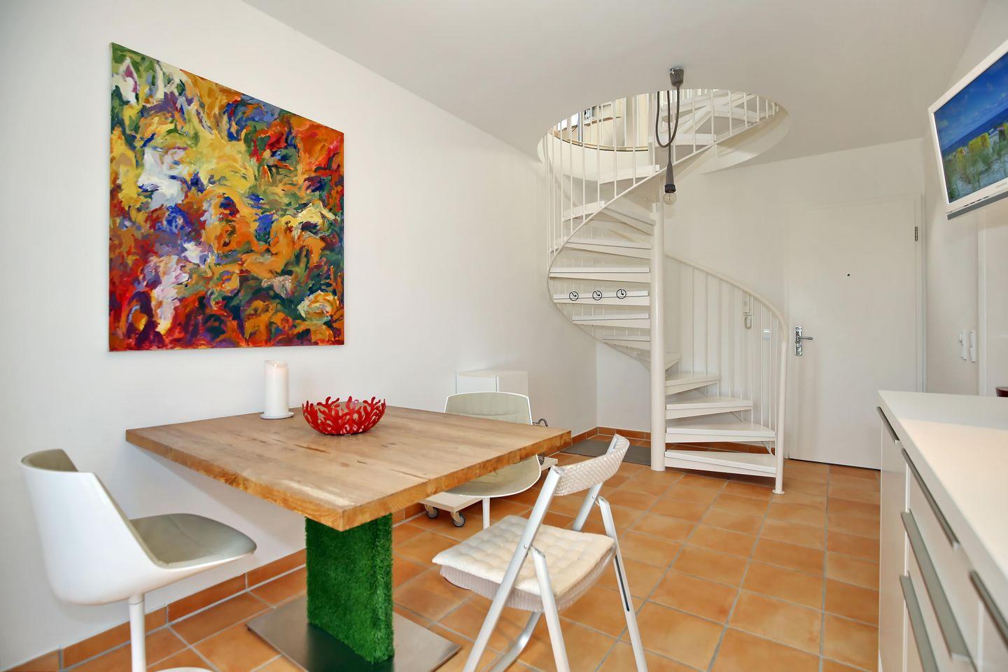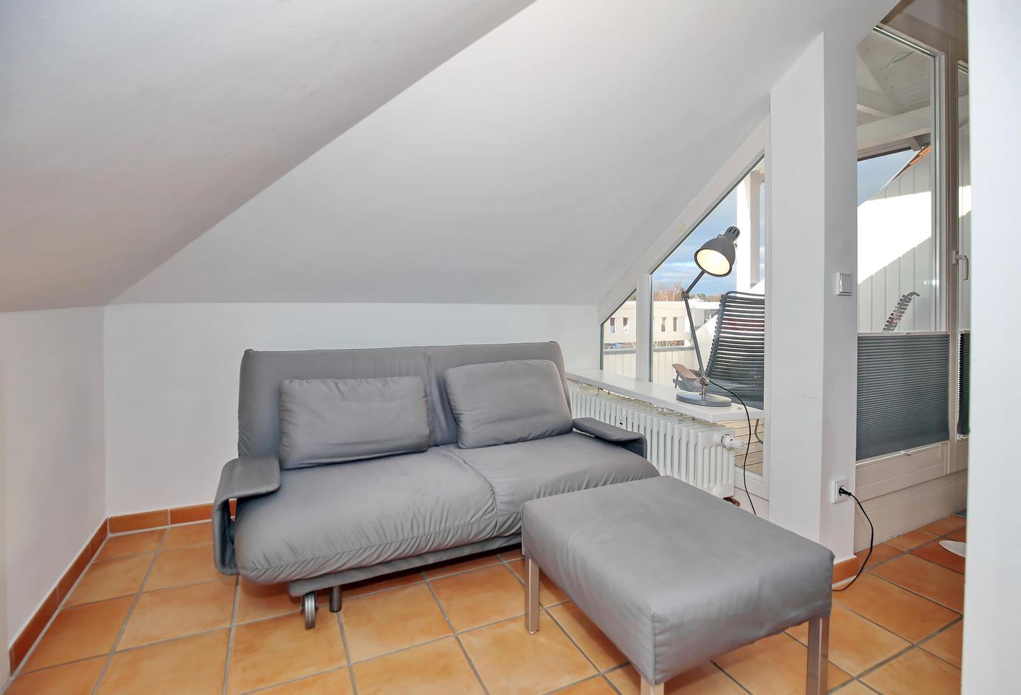 Für erholsame Nächte steht dir in der Schlafnische ein großes Doppelbett (2 x 90 x 200 cm) bereit. Eine Garderobennische und eine Kommode bieten dir Platz für deine Urlaubsgarderobe. Auf der oberen Etage findest du auch das zusätzliche WC. Auf dem ausklappbaren Sofa neben der Loggia lassen sich durch den schwenkbaren TV gemütliche Fernsehabende verbringen. Plissees an den Fenstern dienen als Verdunkelungsmöglichkeit. Über die Wendeltreppe gelangst du vom Dachgeschoss in den Essbereich mit der offenen Küche.