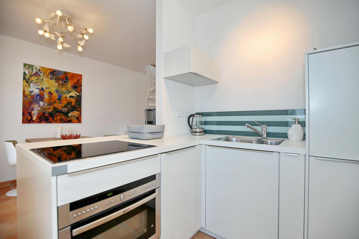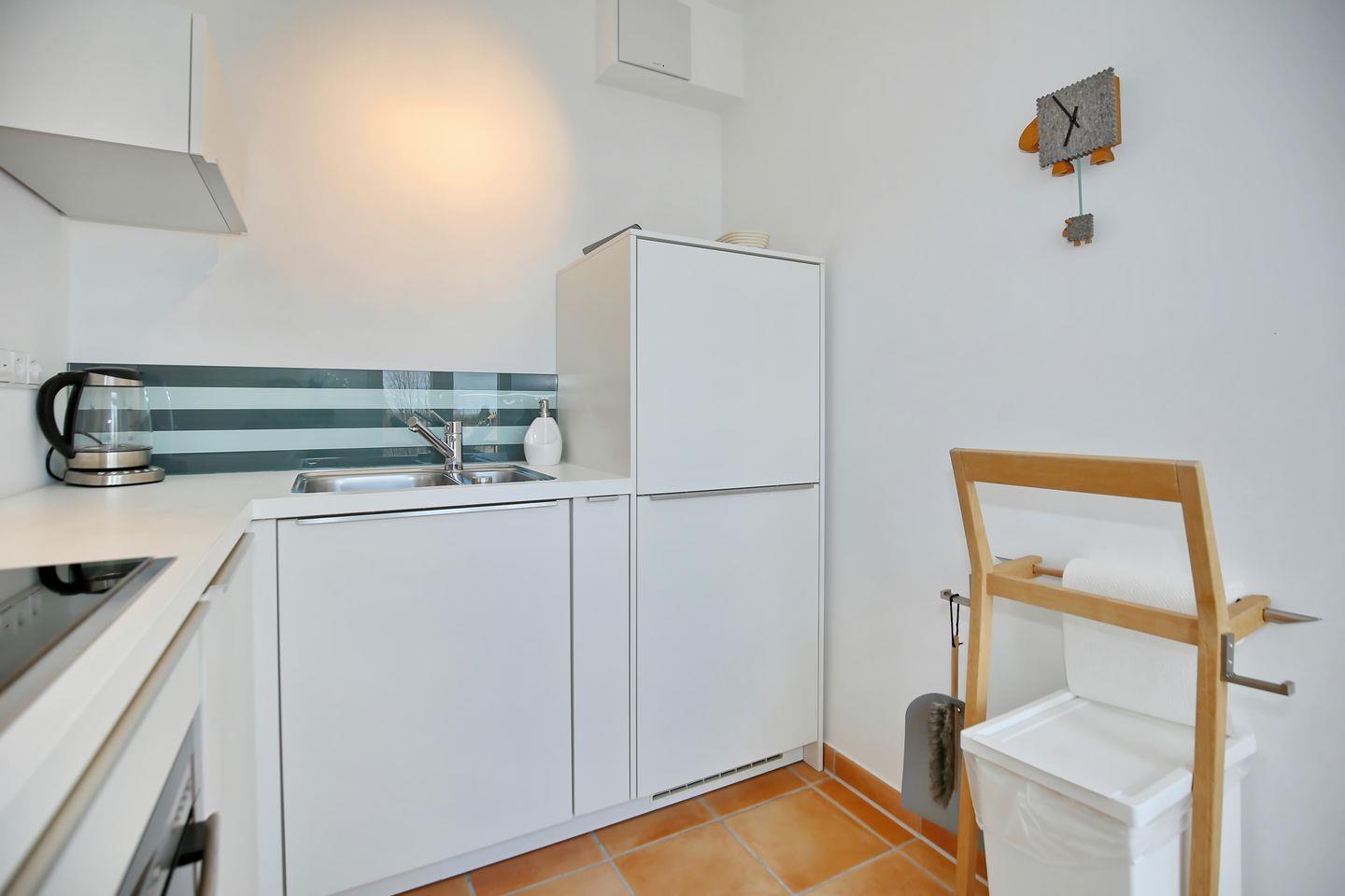 Die Küche ist mit einem 4-Platten-Induktionsherd, einer Geschirrspülmaschine, einem Backofen und einem Kühlschrank mit Gefrierfach ausgestattet. Vervollständigt wird die Ausstattung durch eine Kaffeemaschine, einen Toaster und einen Wasserkocher. Am gegenüberliegenden Esstisch hast du ausreichend Platz für gemeinsame Mahlzeiten. Für Unterhaltung steht dir ein Radio und ein Flachbild-TV zur Verfügung. Bei geöffneten Flügeltüren scheint die Morgensonne herrlich in die Küche und in den Essbereich.