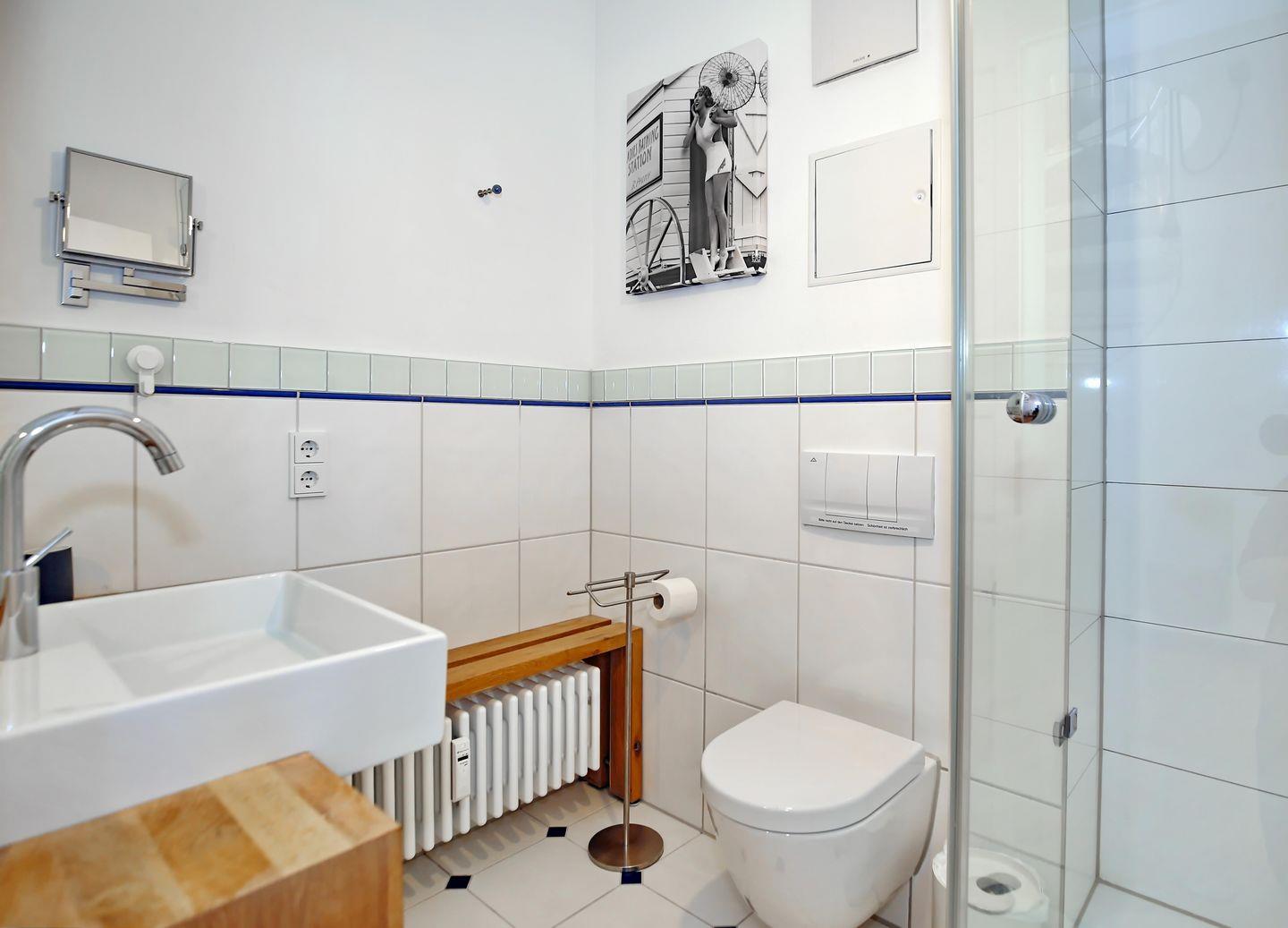 Das moderne Bad ist mit einem Waschtisch, einer Dusche, einem Haartrockner und einem WC ausgestattet. Die gesamte Ferienwohnung verfügt über Fliesen als Bodenbelag.