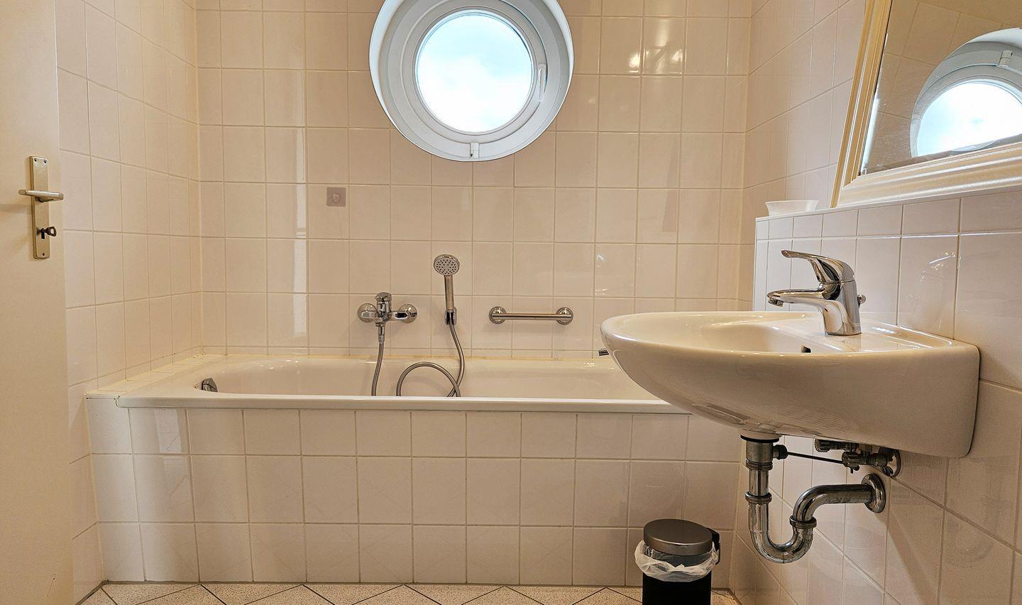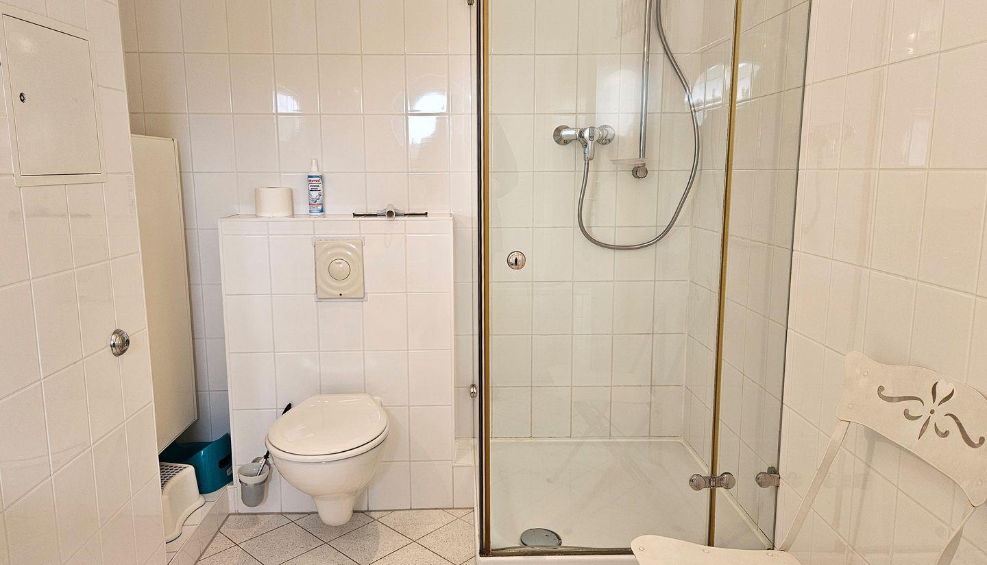 Das großzügige Badezimmer bietet neben einer Dusche mit Wanne auch eine Badewanne, WC, Waschbecken, Spiegel, Fenster sowie einen Haartrockner. Warmes Wasser ist selbstverständlich vorhanden. Eine Waschmaschine zur Eigennutzung steht Ihnen ebenfalls zur Verfügung, was insbesondere für längere Aufenthalte oder Familien mit Kindern von Vorteil ist.