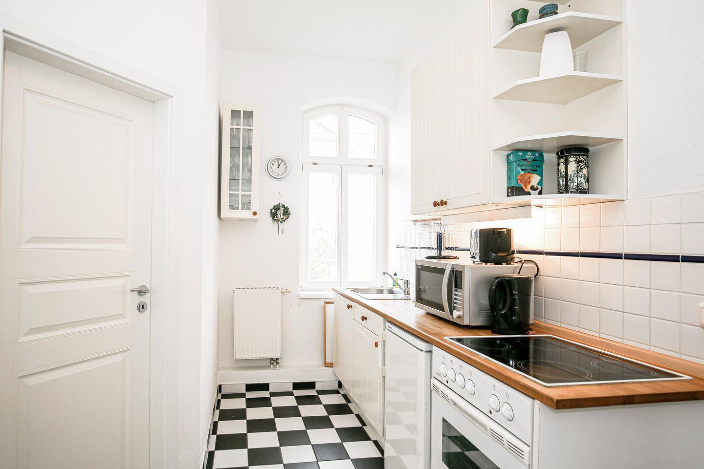 Die kleine separate Küche ist bis ins Detail ausgestattet. Neben einem Backofen, einem 4-Plattenherd, einem Wasserkocher, einem Toaster und einer Kaffeemaschine stehen dir diverse Kochutensilien zur Verfügung.