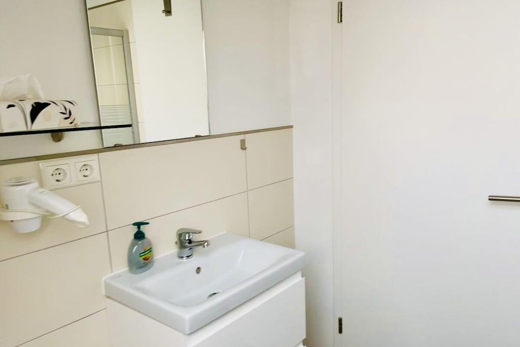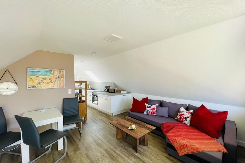 Unser freundliches Apartment befindet sich im Obergeschoss, ist circa 48m² groß und verfügt über einen Wohn-und Essbereich, welcher mit Couch, kleinem Esstisch , Smart-TV ausgestattet ist. Die offene Küche verfügt unter anderem über einen Geschirrspüler, Backofen mit 4-Platten-Cerankochfeld, Kühlschrank, Toaster, Kaffeemaschine & Wasserkocher. Von hier aus gelangen Sie ins Schlafzimmer, welches über ein gemütliches Doppelbett und einen Kleiderschrank verfügt. Das kleinen Badezimmer mit Dusche und WC lässt keine Wünsche offen. Dieses sympathische Apartment eignet sich hervorragend für Paare, die Ihre Urlaubszeit gerne aktiv gestalten und unsere Region erkunden möchten. Es handelt sich um eine Nichtraucherunterkunft in der Hunde auf Anfrage gestattet sind.