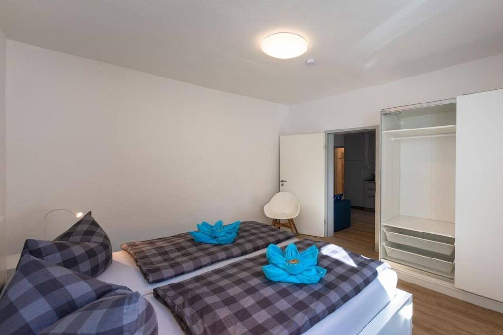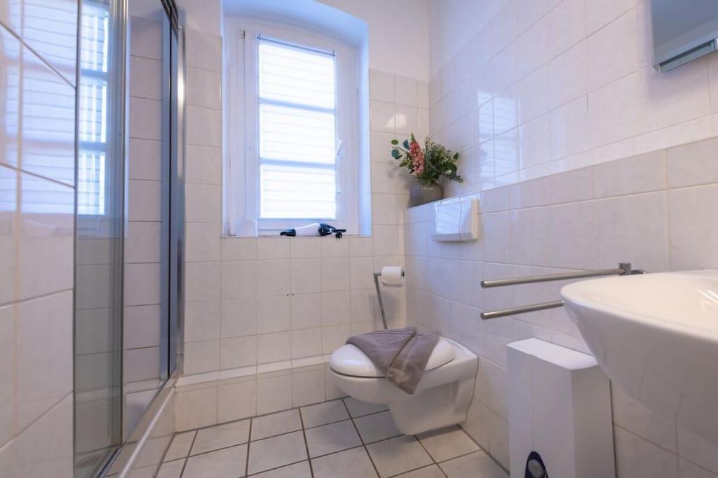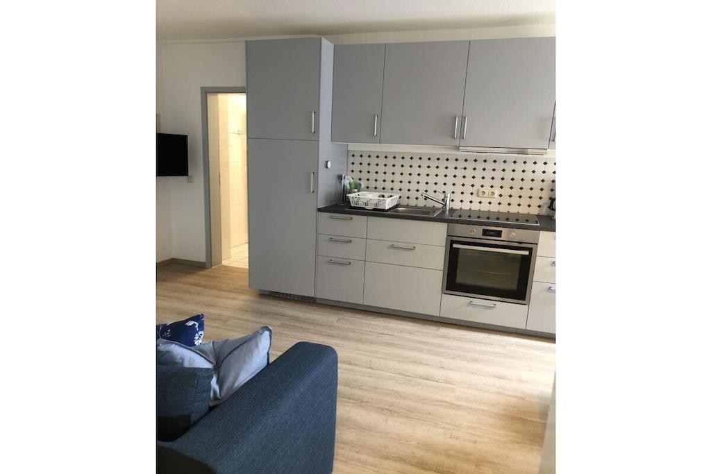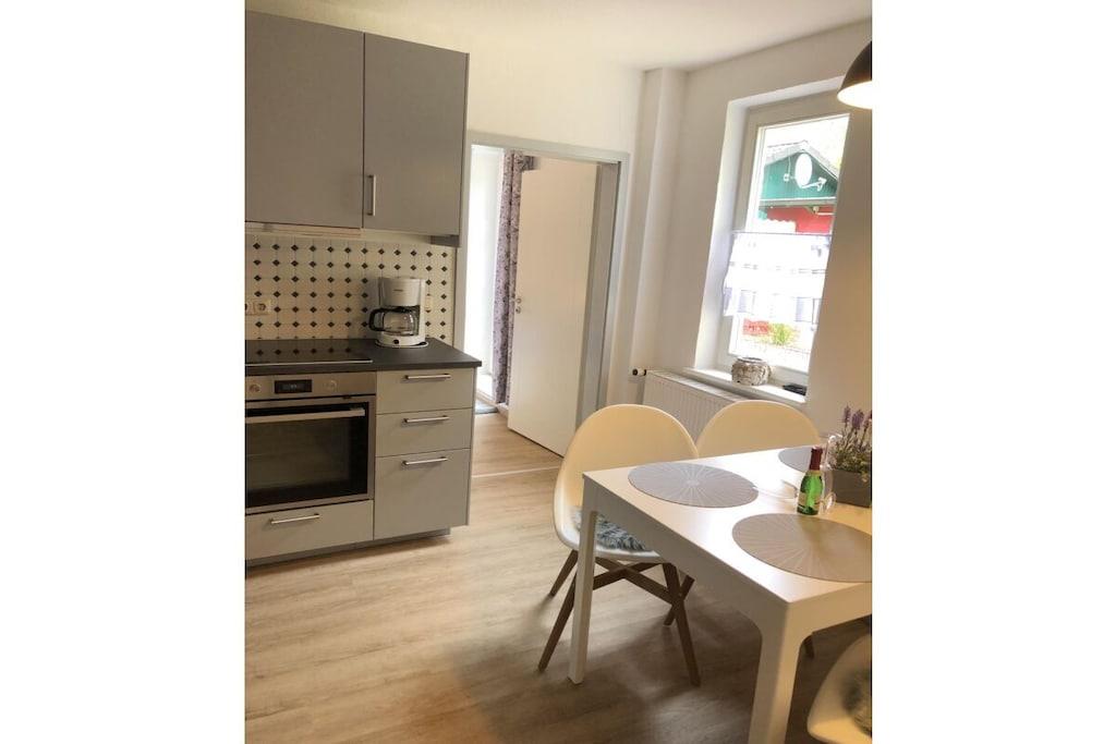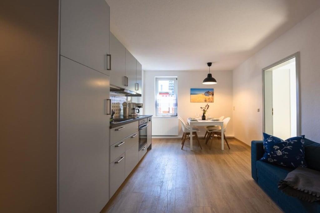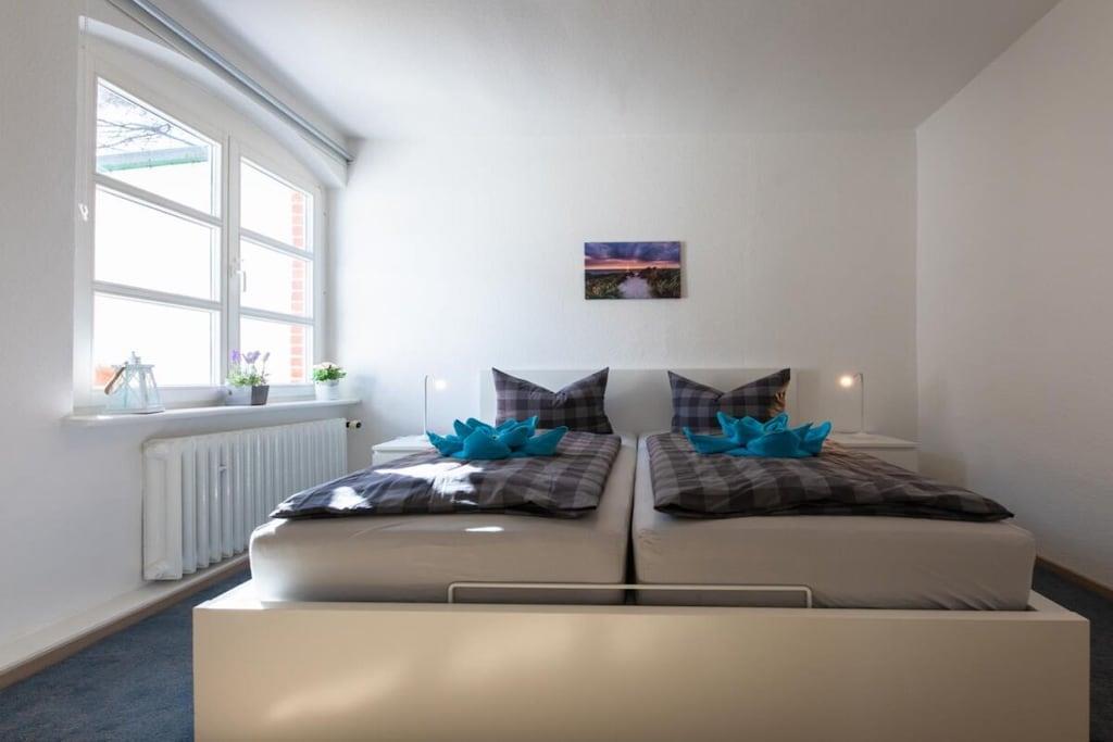 The "Nordstrand" holiday home boasts a fantastic location in the immediate vicinity of the pier. The house has five holiday apartments, all of which have been renovated and newly furnished. The cozy "Ahrenshoop" holiday apartment (approx. 50 sq. m) accommodates four people and is located on the ground floor of the holiday home. Bright, welcoming rooms offer space for relaxation. The new fitted kitchen is equipped with everything you need for self-catering on vacation. The bedroom has a large double bed and a spacious wardrobe. The bright and welcoming living room has a very comfortable sofa bed, so that two people can comfortably sleep here. The living room leads to the small terrace. Here you can relax and start the day with a healthy breakfast and end the evening with a glass of wine. The beach chair (available from May to October) invites you to simply unwind with a good book in hand. The bathroom with a window has a toilet, shower, and sink. The apartment includes a parking space. Wi-Fi is free. Your bikes can be locked in the shed. The entire house is non-smoking. Your four-legged friend is welcome (for an additional charge).