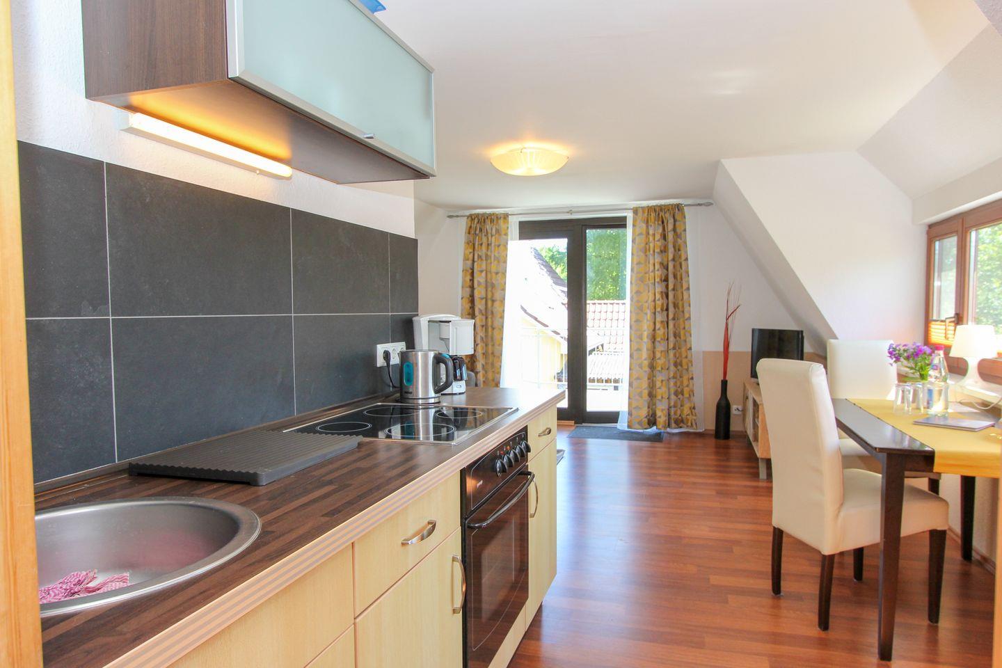 Die Ferienwohnung hat 40 m² und bietet alles, was Sie für einen entspannten Aufenthalt benötigen. Der offene Küchenbereich ist modern gestaltet, mit einem Ceranherd, Backofen, Kühlschrank sowie einer Kaffeemaschine, Toaster und Wasserkocher ausgestattet. Hier zaubern Sie mühelos ein köstliches Frühstück oder bereiten ein geselliges Abendessen am Esstisch vor.