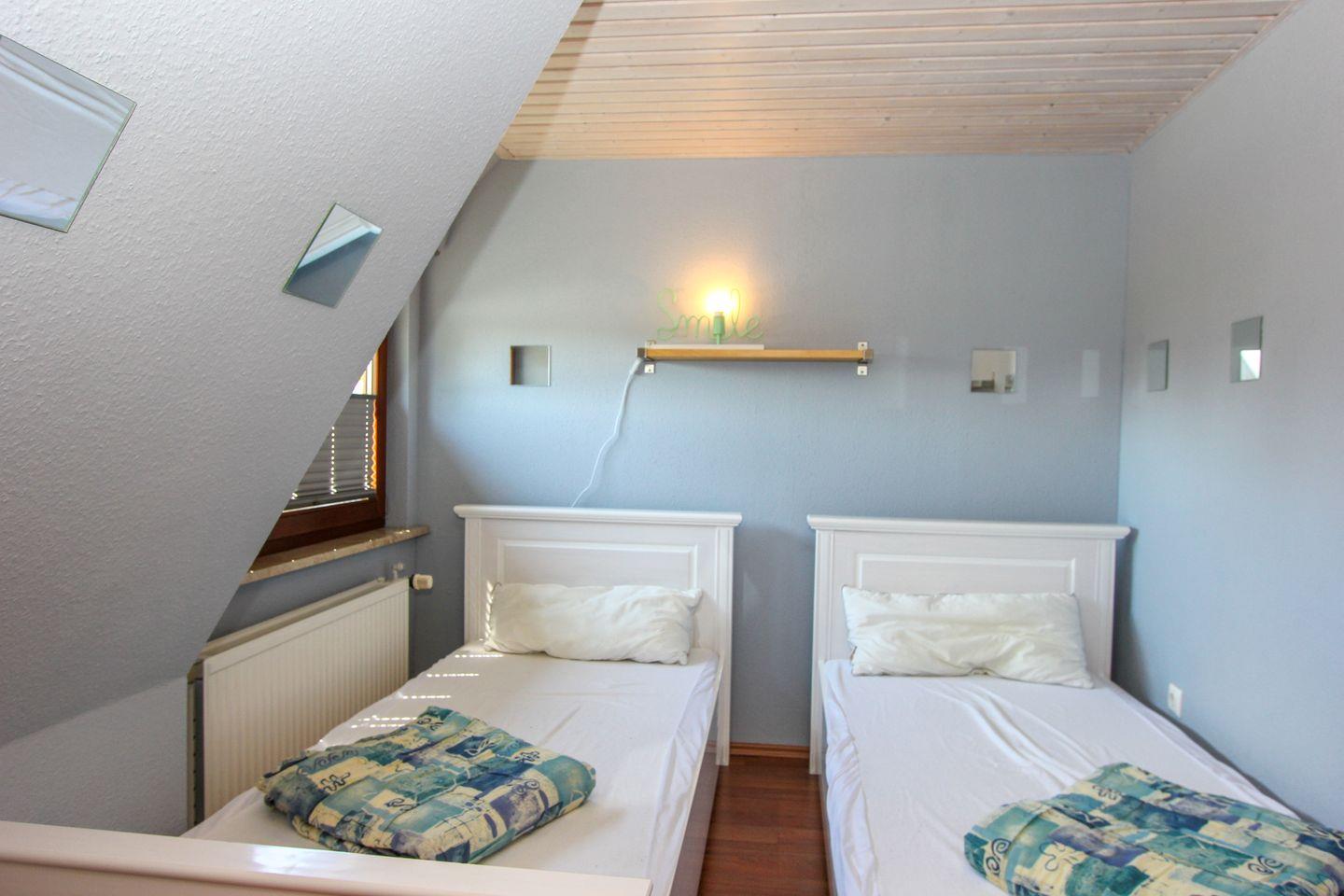 Die Ferienwohnung verfügt über ein Schlafzimmer, das Platz für zwei Personen bietet. Hier finden Sie Ruhe und Erholung. Das Badezimmer ist funktional ausgestattet mit einer Dusche, Waschbecken und WC – ideal, um sich nach einem Strandtag frisch zu machen.