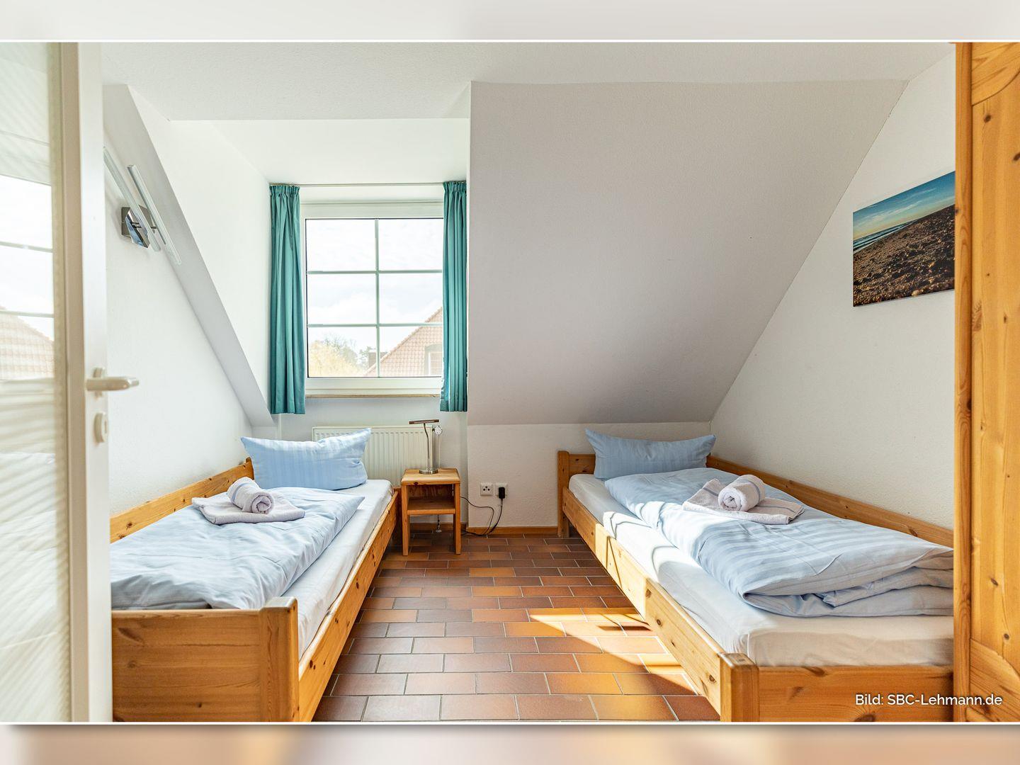 Im hellen Dachgeschoss der Wohnung befinden sich die zwei Schlafzimmer, eines mit Doppelbett, das andere mit zwei Einzelbetten. Auf dieser Ebene befindet sich auch das zweite Duschbad mit WC.