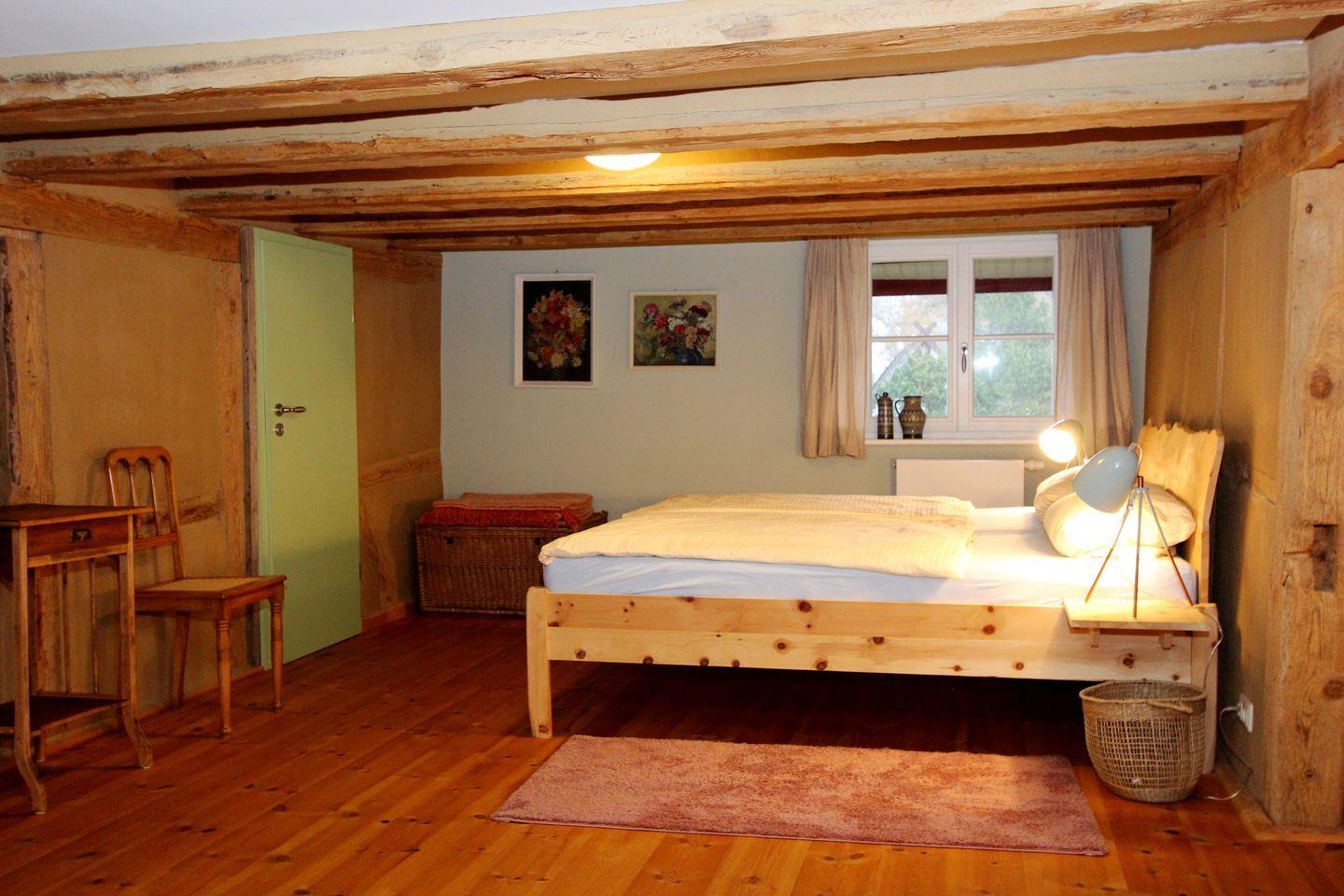 Über eine Treppe gelangen Sie in das Obergeschoss des Hauses, wo sich das sehr großzügige Schlaf- und Wohnzimmer, das Kinderzimmer und das Duschbad inklusive WC befindet. Bitte beachten Sie die original erhaltene geringe Raumhöhe im OG.