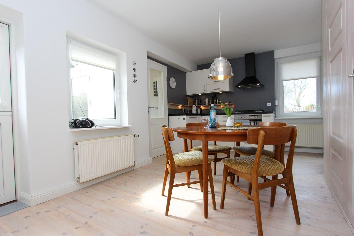 Über den Garten mit angrenzender Süd-Terrasse gelangen Sie in diese gut und modern ausgestattete Ferienwohnung. Über den kleinen, aber gut durchdachten Eingangsbereich gelangen Sie in die vollausgestattete Küche und an den sonnigen Esstisch am Fenster. Von hier aus können Sie über eine Terrassentür den schönen, ruhigen Garten betreten.
