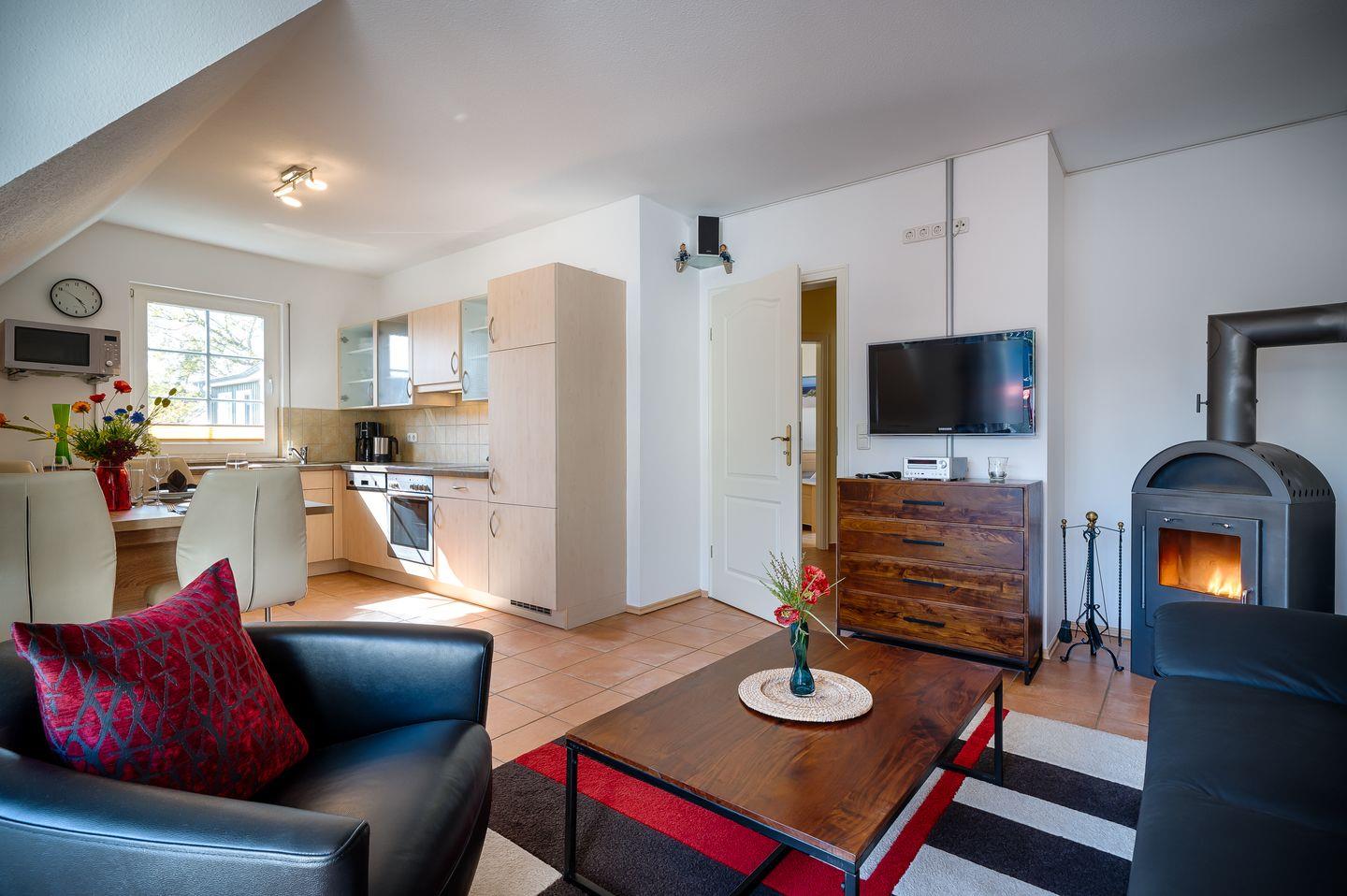 Wohnraum mit Ledergarnitur, offene Einbauküche und Esstisch für 4 Personen