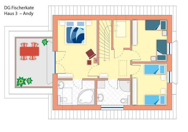 1 Schlafzimmer mit Doppelbett (1,80x2,00m), mit verstellbaren Lattenrosten, TV, eigenem Bad mit Wanne, ebenerdiger Dusche, Zugang zur Dachterrasse