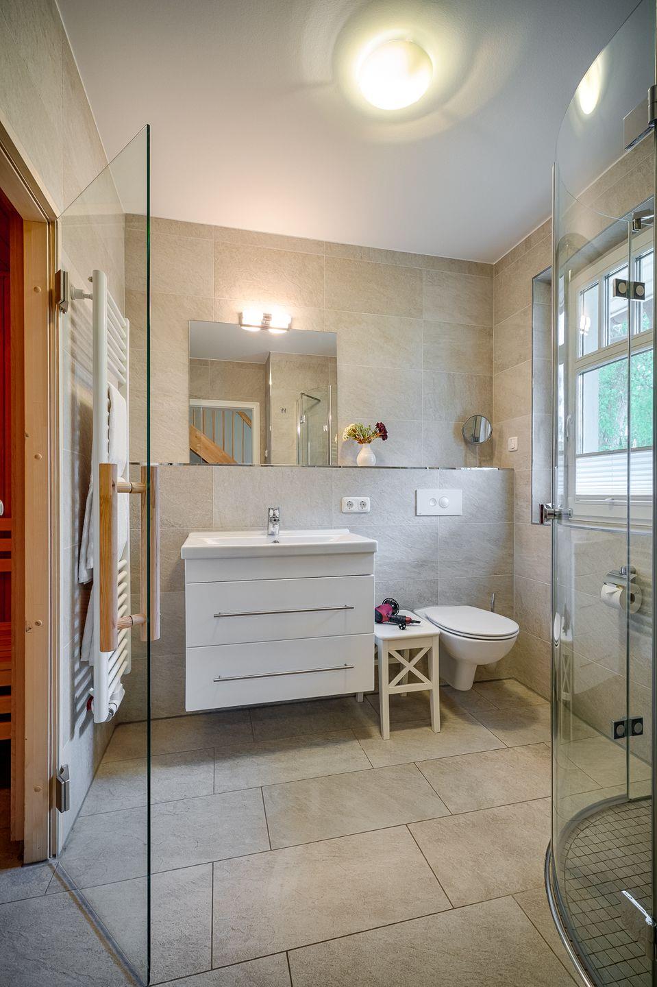 Bad mit ebenerdiger Dusche, anliegender Sauna