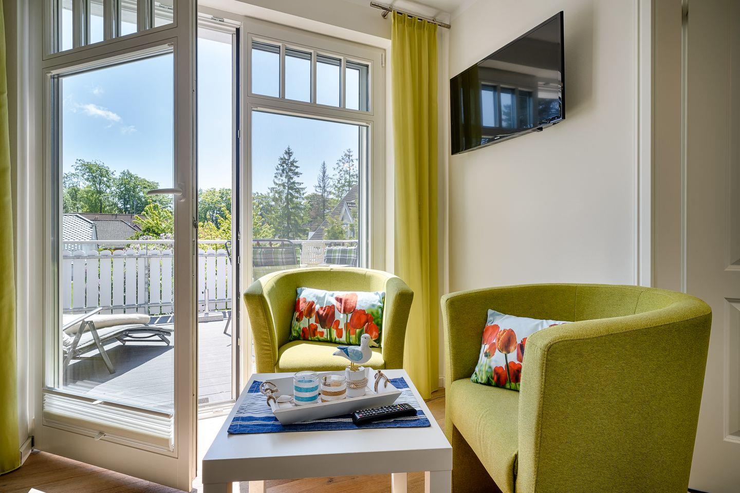 1 Schlafzimmer mit Doppelbett (1,80x2,00m), verstellbare Lattenroste, Sat-TV, und eigenem Bad mit ebenerdiger Dusche