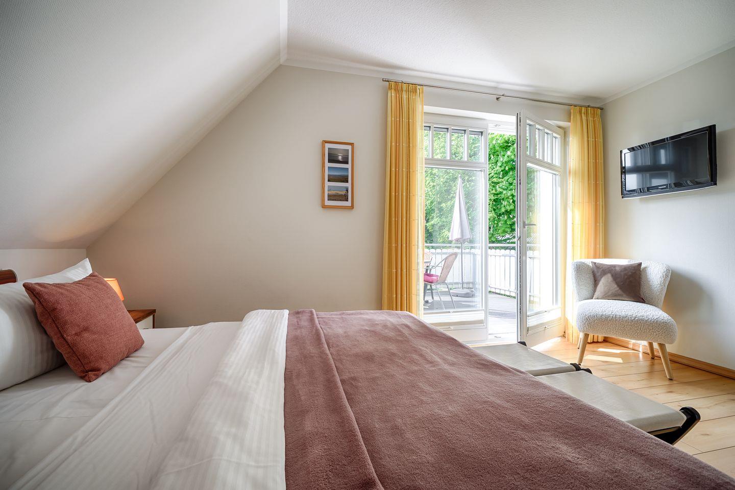 1 Schlafzimmer mit Doppelbett (1,80x2,00m), verstellbare Lattenroste, LCD-Sat-TV, eigenem Badezimmer mit Badewanne,