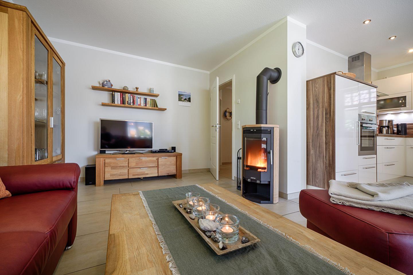 Wohnbereich mit Ledersitzecke, Esstisch für 8 Personen in der Darß-Veranda