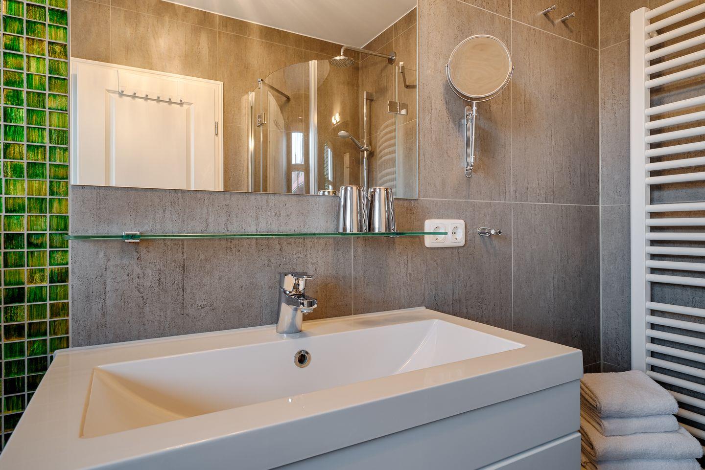 großes Bad mit ebenerdiger Dusche, Sauna (ohne Gebühren)