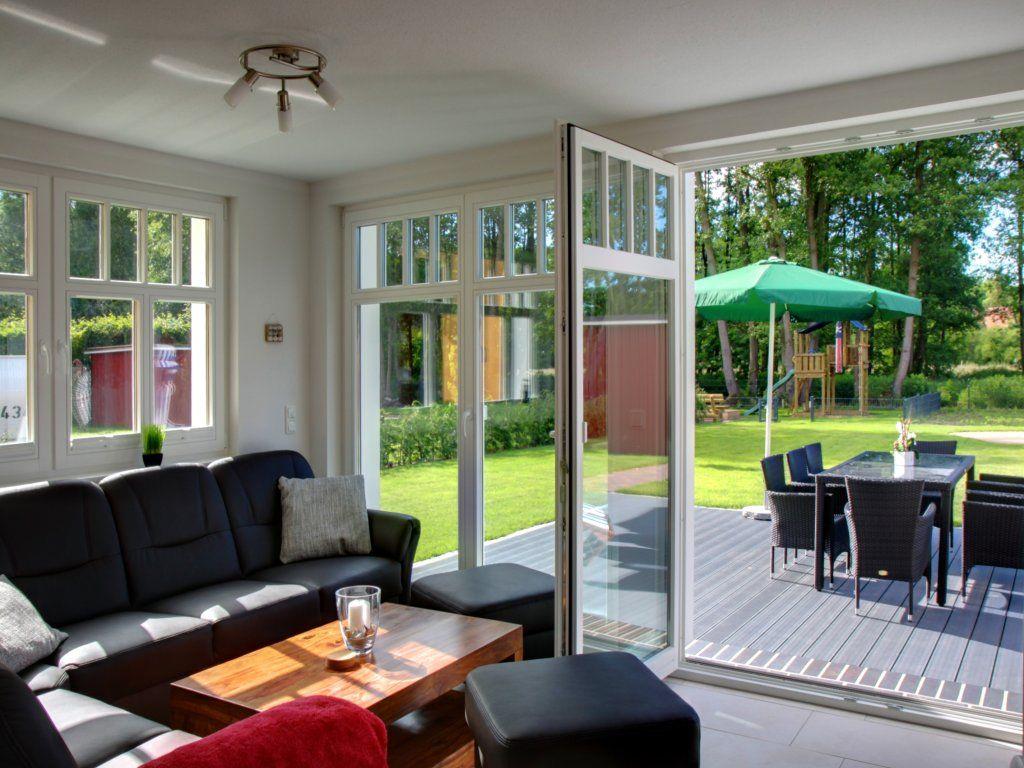 Wohnraum mit Ledercouch und Wintergarten, Esstisch für 8 Personen