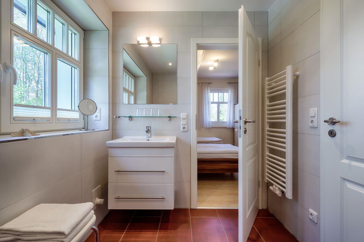 Bad mit ebenerdiger Dusche, anliegender Münzsauna (2,00€ /Std.)