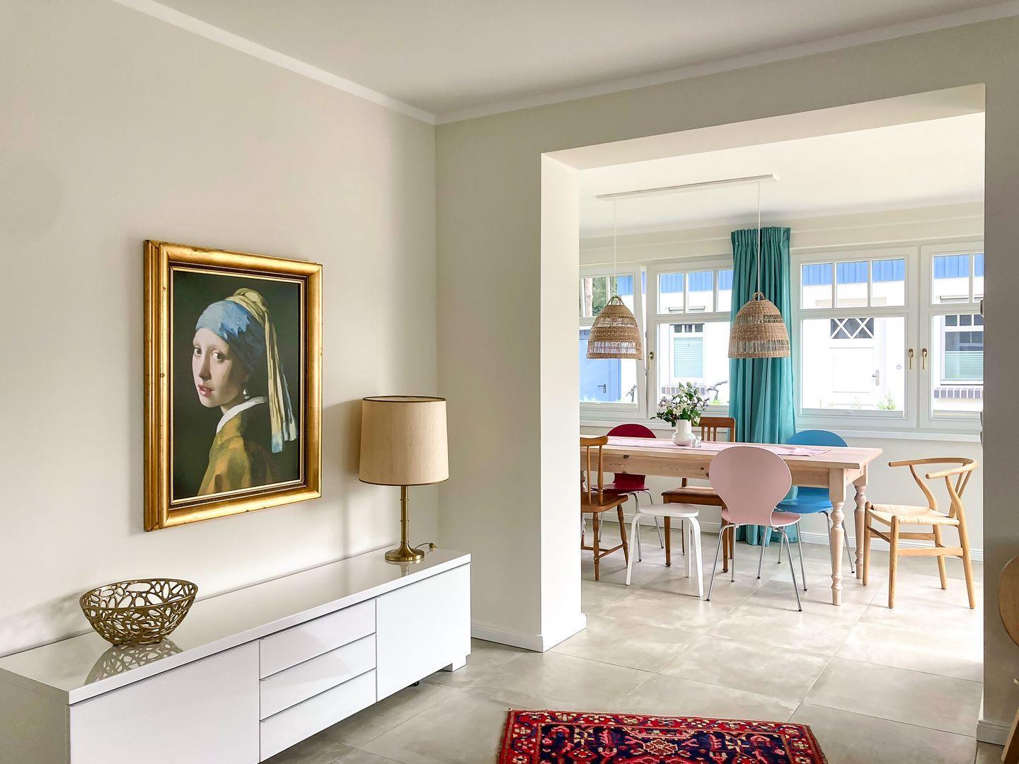 Wohnraum mit Sofa und Sessel, TV, Bücherregal, Kommode mit Gesellschaftsspielen