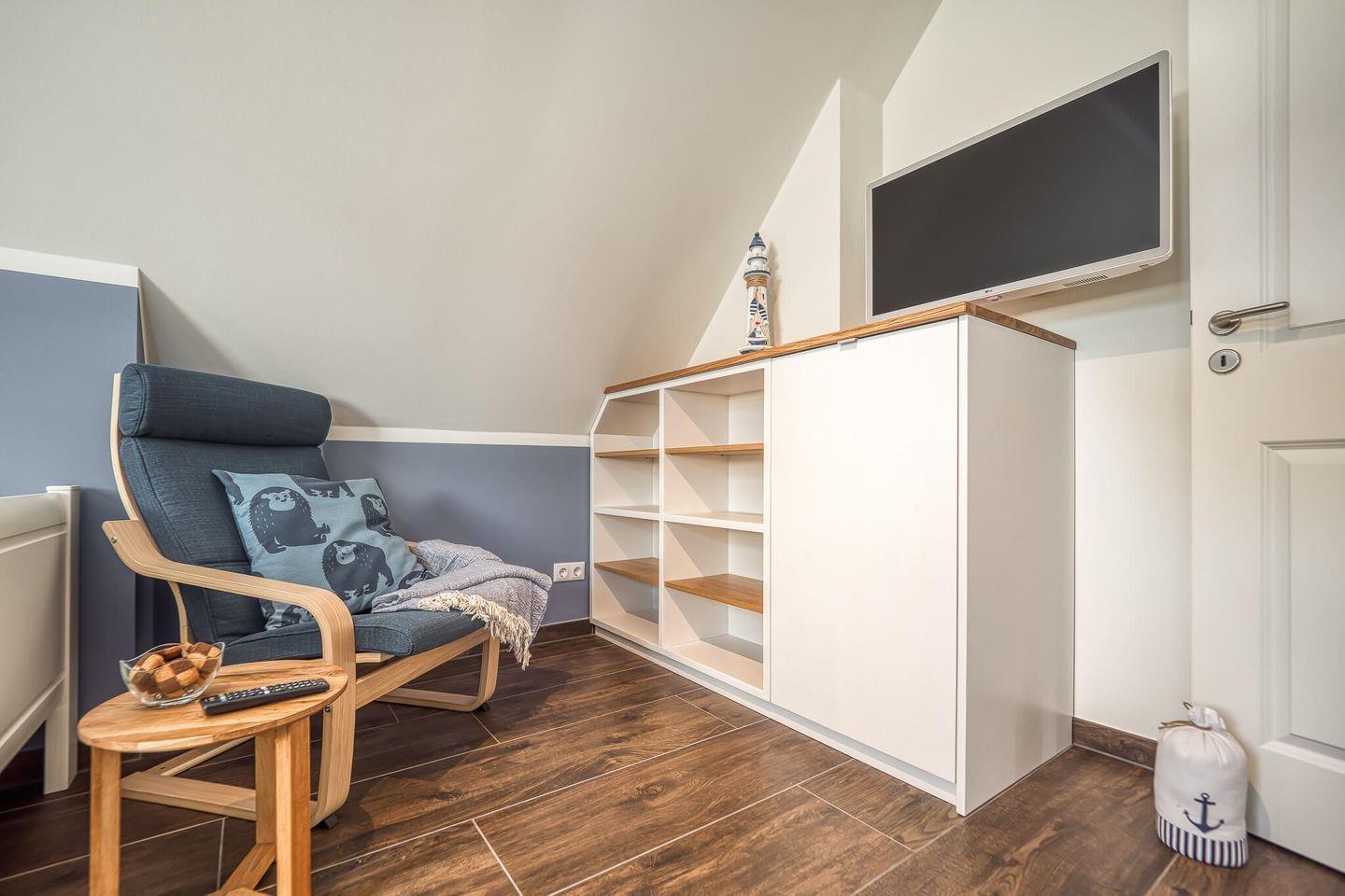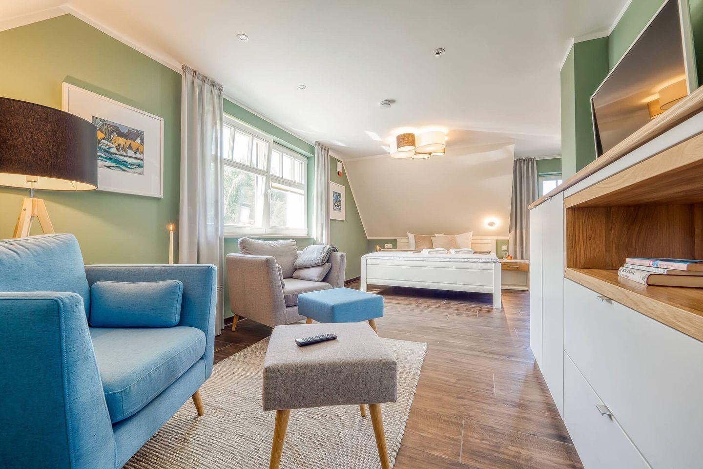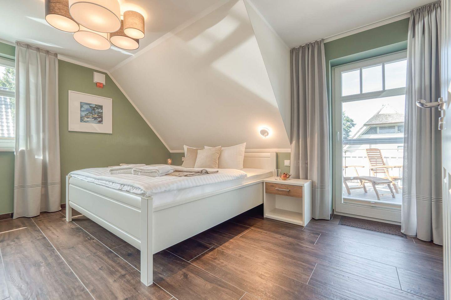 1 Schlafzimmer mit Doppelbett (1,80x2,00m), Taschenfederkernmatratzen, verstellbare Lattenroste, TV, Sitzecke, Zugang zur Dachterrasse