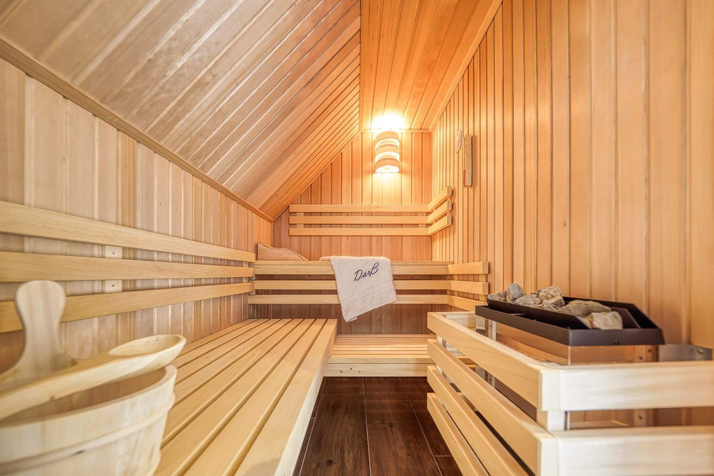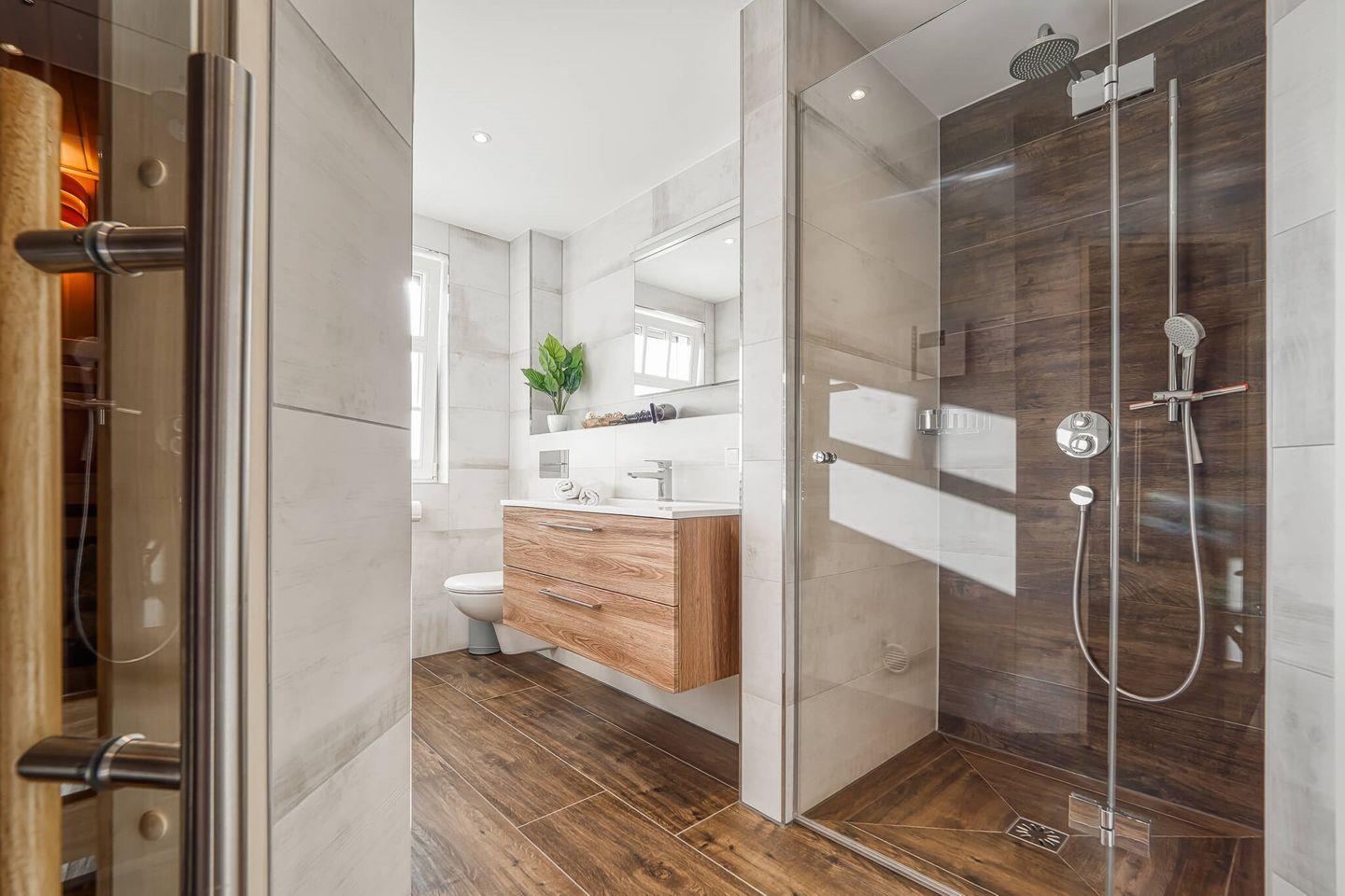 Tageslichtbad mit ebenerdiger Du/WC und anliegender Sauna (ohne Gebühren), Handtuchwärmer, Fön und Kosmetikspiegel