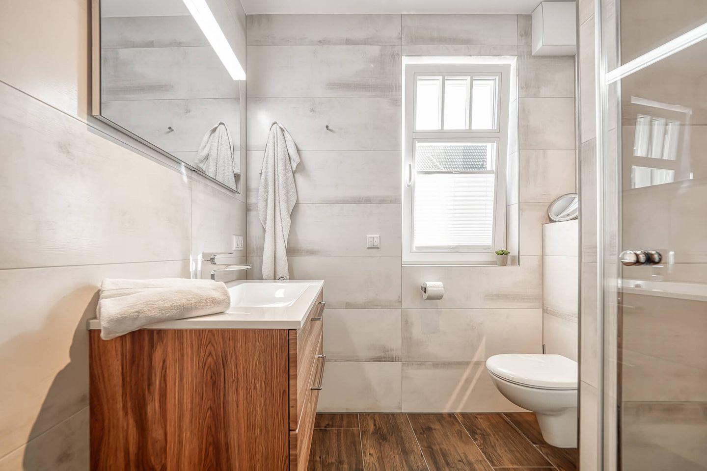 Tageslichtbad mit ebenerdiger Du/WC, Handtuchwärmer, Fön und Kosmetikspiegel