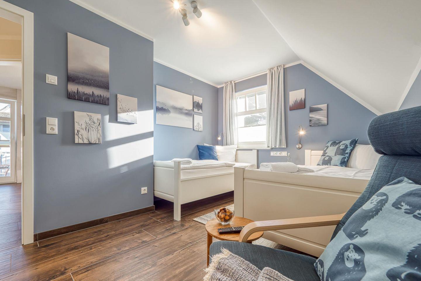 1 Schlafzimmer mit je 2 Einzelbetten (0,90x2,00m und 0,90x1,90m), Taschenfederkernmatratzen, verstellbare Lattenroste, TV