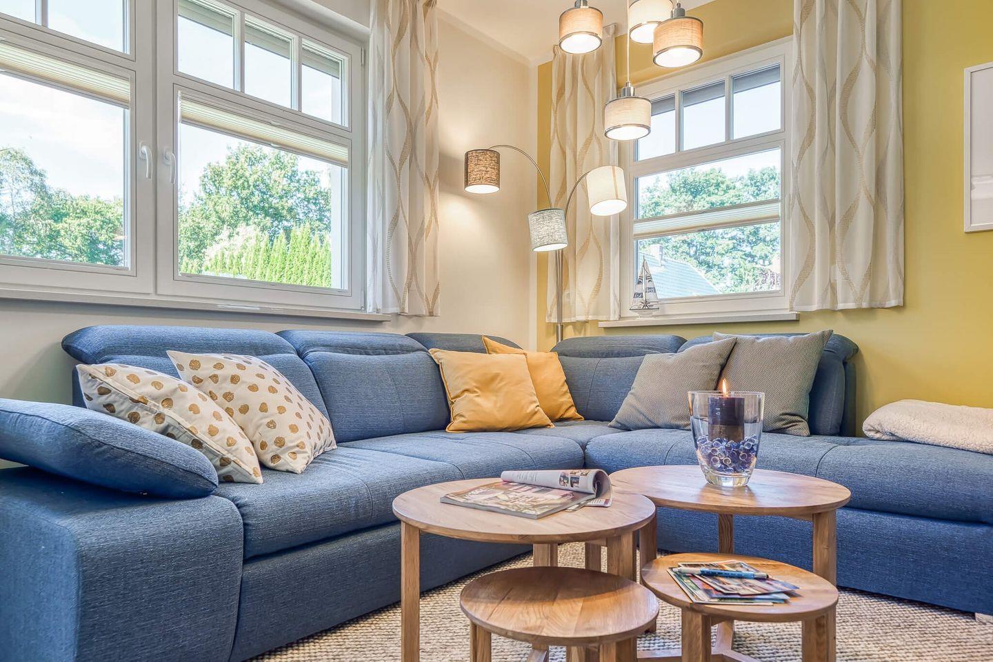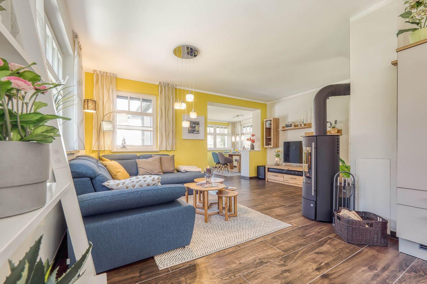 Wohnbereich mit Couchgarnitur, TV, DVD-Player, Apple-TV, kleiner Bibliothek, Kaminofen