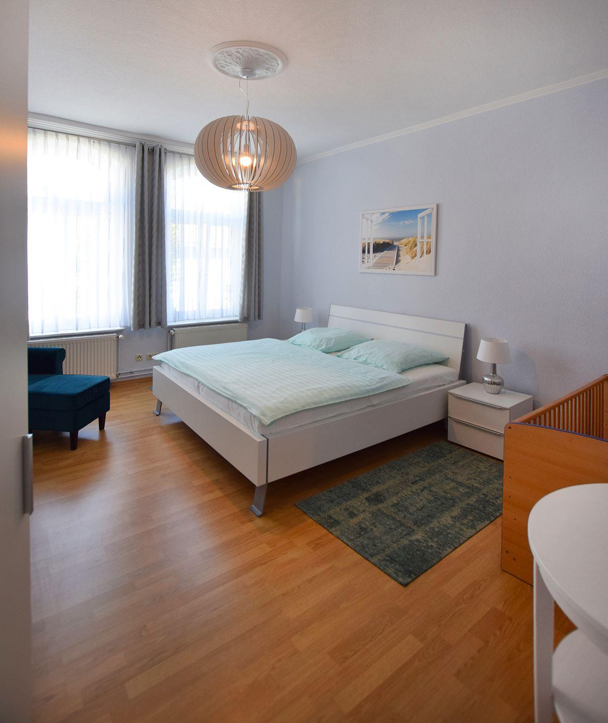 Ein separates Schlafzimmer mit einem großen Doppelbett (180 x 200 cm) und einem gemütlichen Sessel sorgt für entspannte Nächte. Ein Kinderbett ist ebenfalls vorhanden, sodass die Wohnung auch für kleine Familien geeignet ist. Das Badezimmer ist mit einer Dusche und WC ausgestattet.
