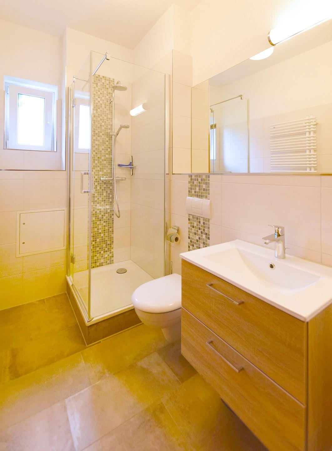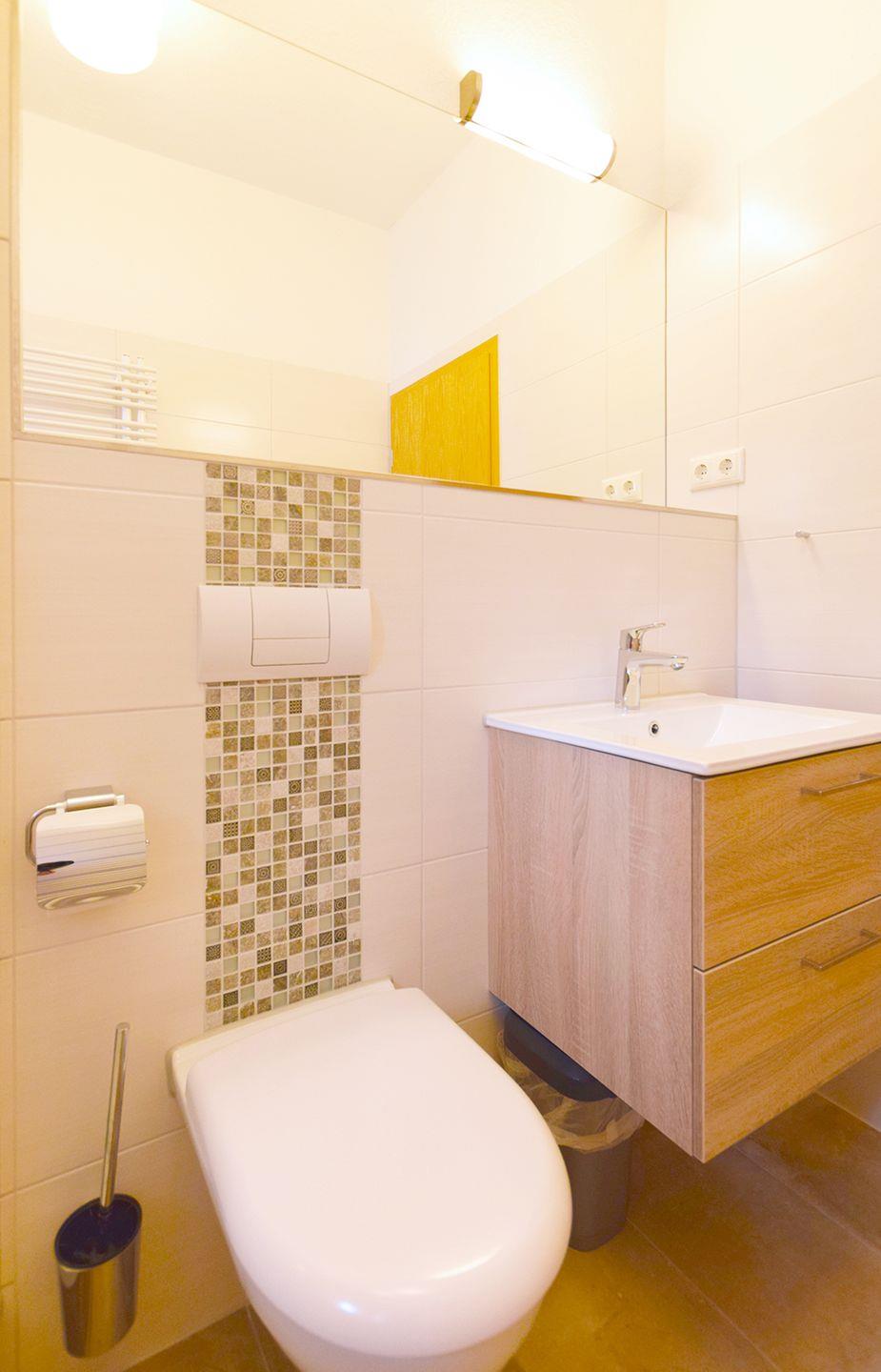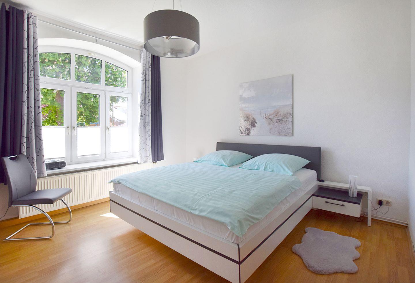 Das Schlafzimmer ist mit einem komfortablen Doppelbett (180 x 200 cm) eingerichtet. Das Badezimmer verfügt über eine Dusche und ein WC. Zur Ferienwohnung gehört