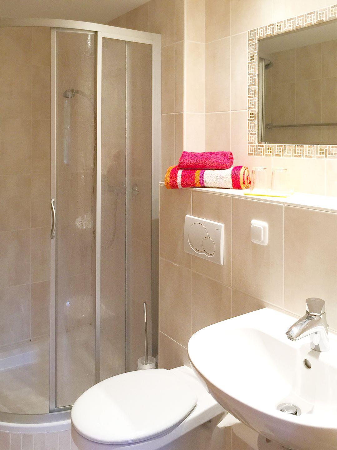 Die gut ausgestattete Küchenzeile verfügt über zwei Cerankochfelder, einen Gourmet-Express-Ofen, eine Dunstabzugshaube, Kaffeemaschine, Kühlschrank (ohne Tiefkühlfach), Mikrowelle, Toaster und Wasserkocher – ideal für die Zubereitung kleiner Mahlzeiten. Das Badezimmer ist mit einer Dusche und einem WC ausgestattet.