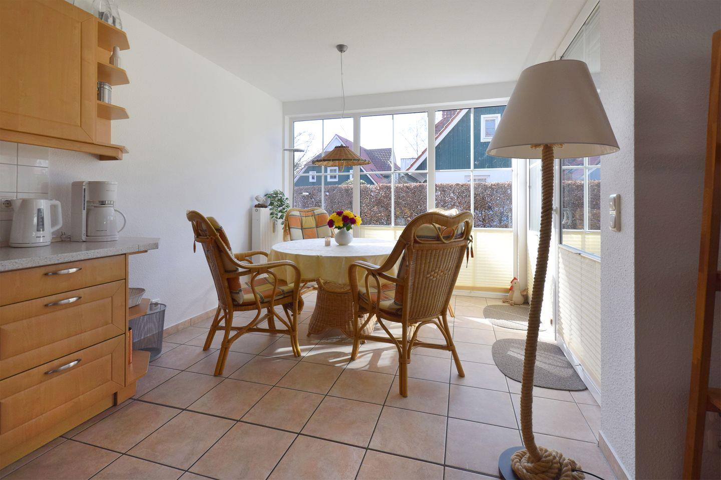 Ferienwohnung bis 4 Personen | ca. 56 m2 Wohnfläche | EG Wohnbereich mit Einbauküche, verglaster Veranda, Bad, 2 Schlafzimmer | Süd-West-Terrasse | 1 Parkplatz | Wohnbereich Esstisch, Sitzgarnitur, Radio mit CD-Player, TV SAT/Kabel | Einbauküche Backofen, Geschirrspüler, Herd, Kaffeemaschine, Kühlschrank mit Gefrierfach, Mikrowelle, Toaster, Wasserkocher | Bad Dusche, Waschmaschine, WC | 2 Schlafzimmer 1 Doppelbett (180 x 200 cm), 2 Einzelbetten (90 x 200 cm) | WLAN | Gemeinschaftliche Nutzung von Fahrradschuppen