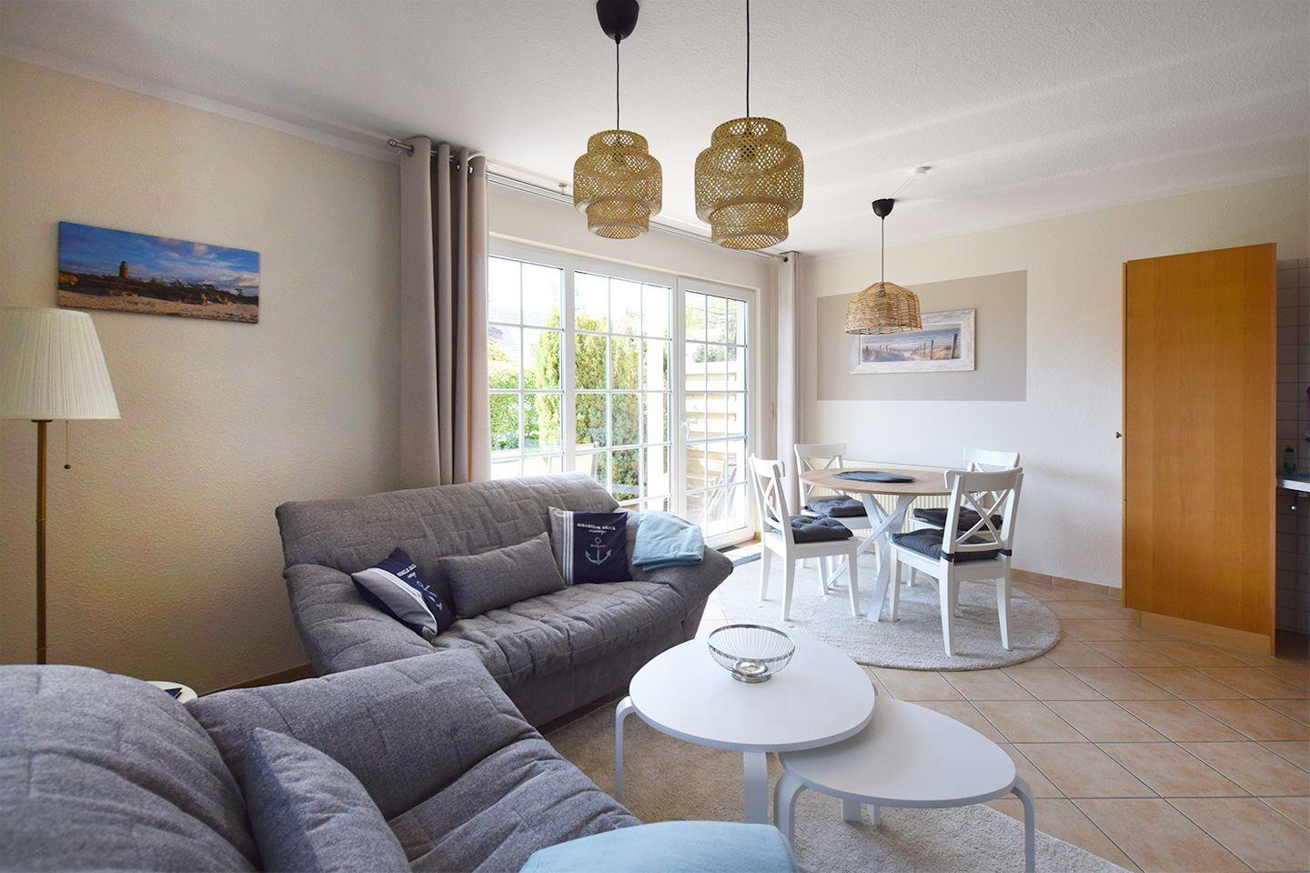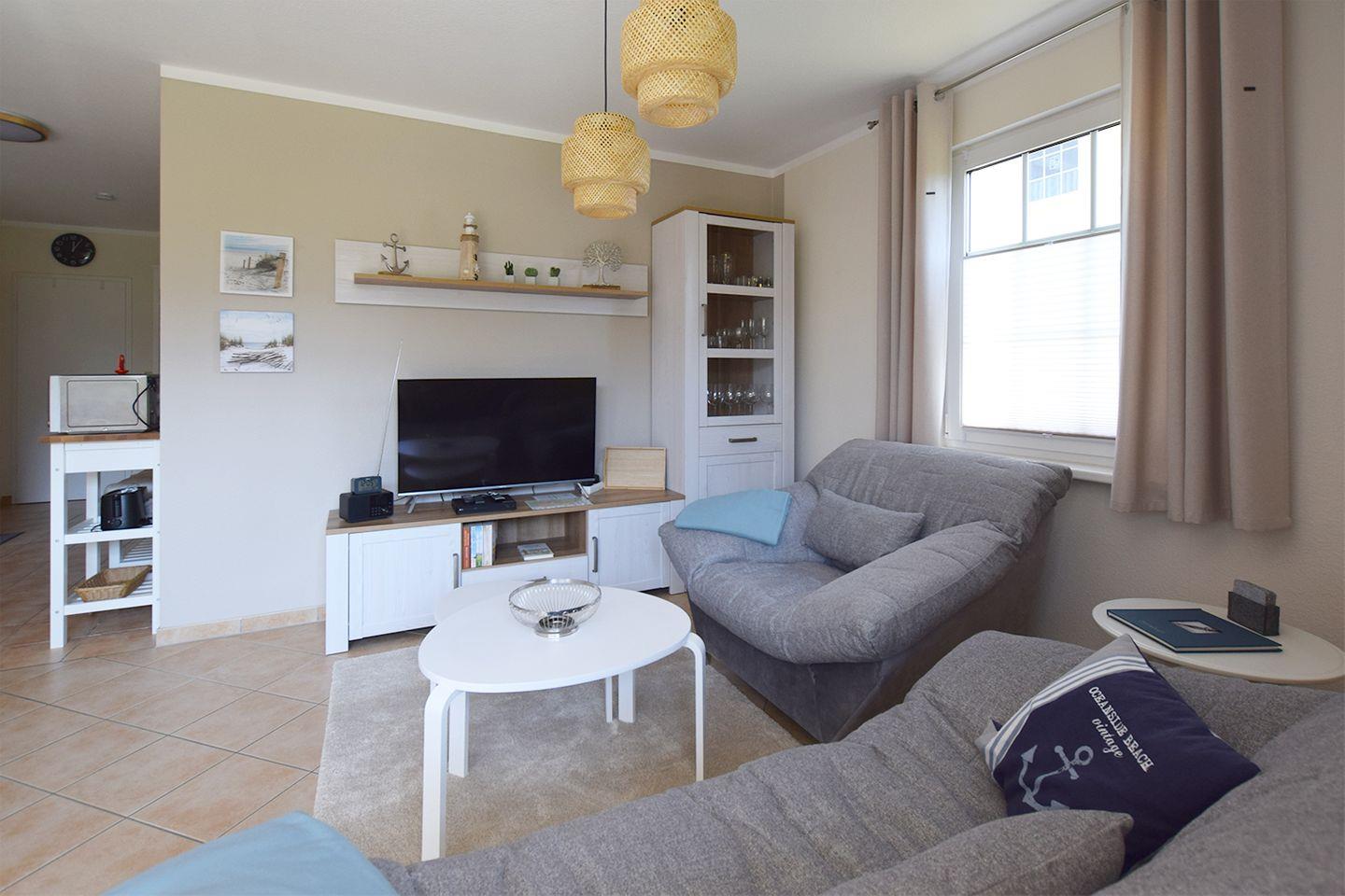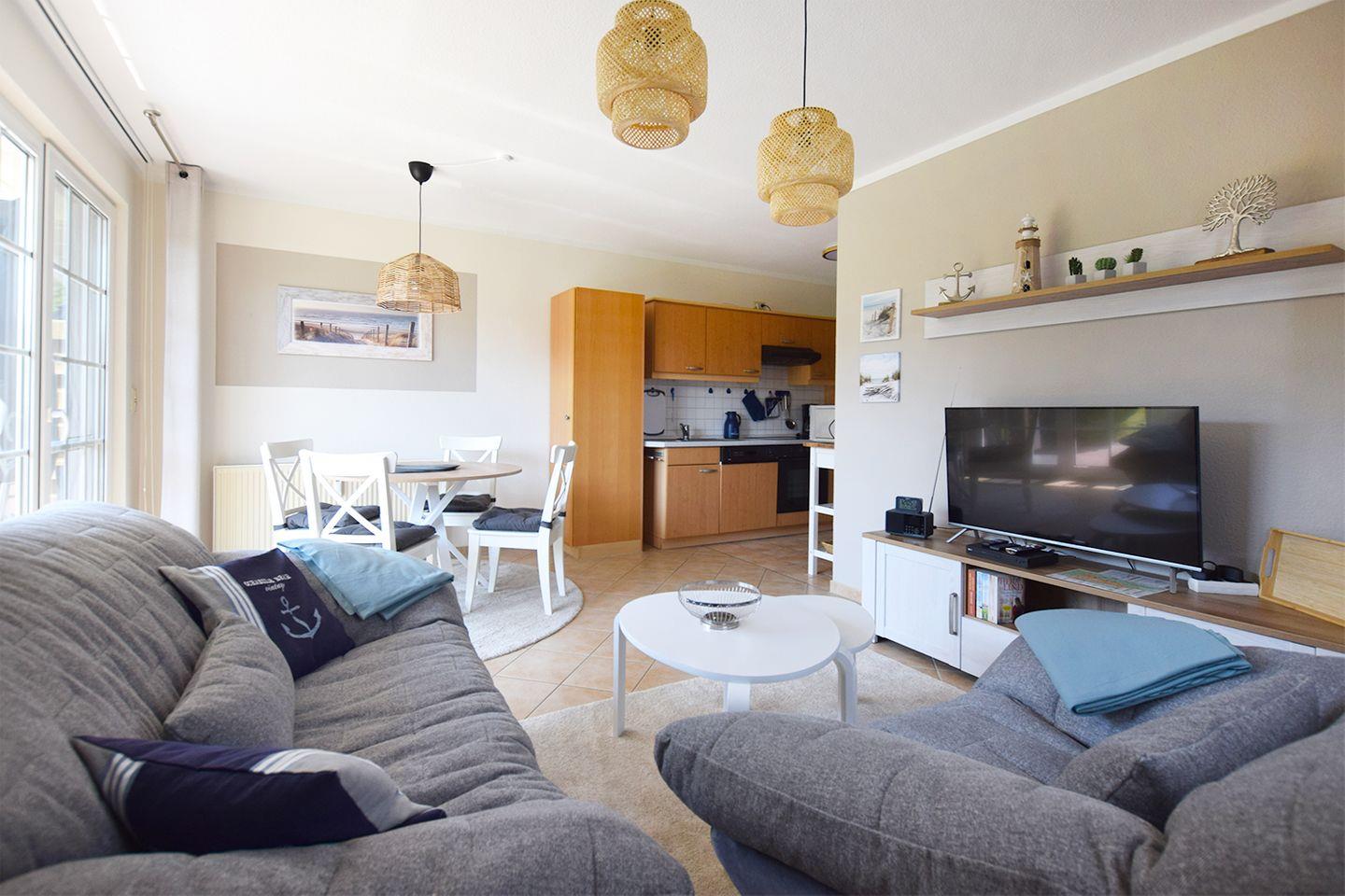 Ferienwohnung bis 4 Personen | ca. 52 m2 Wohnfläche | EG Wohnbereich mit Einbauküche, Bad, 2 Schlafzimmer | Süd-Terrasse | 1 Parkplatz | Wohnbereich Esstisch, Sitzgarnitur, Radio mit CD/DVD-Player, TV SAT/Kabel | Einbauküche Backofen, Geschirrspüler, Herd, Kaffeemaschine, Kühlschrank mit Gefrierfach, Mikrowelle, Toaster, Wasserkocher | Bad Dusche, Waschmaschine, WC | 2 Schlafzimmer 1 Doppelbett (180 x 200 cm), 1 Doppelbett (140 x 200 cm) | ohne Bettwäsche und Handtücher | WLAN | Gemeinschaftliche Nutzung von Fahrradschuppen, Grillecke, Sandkasten