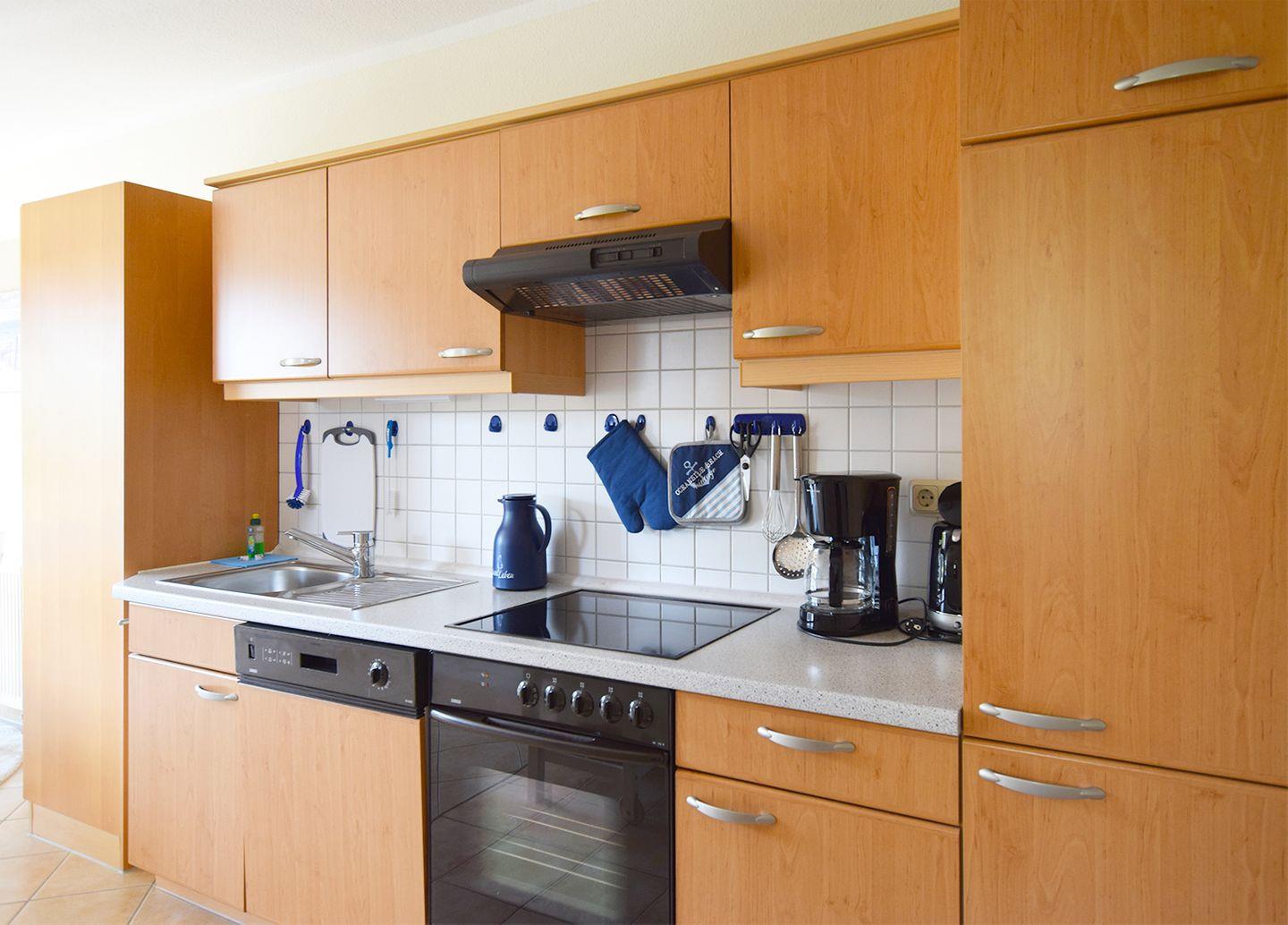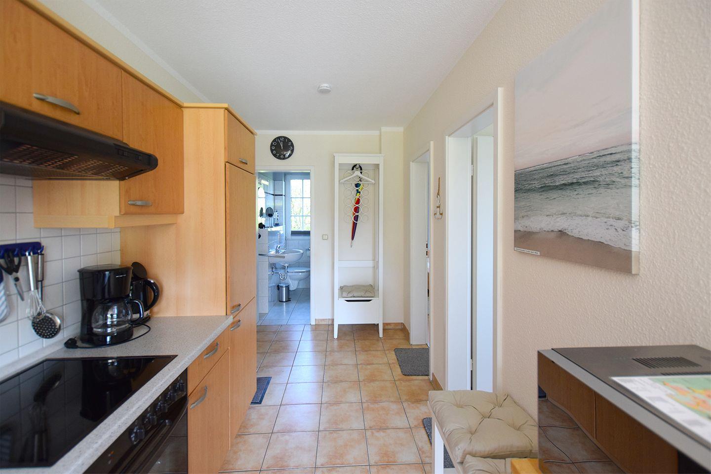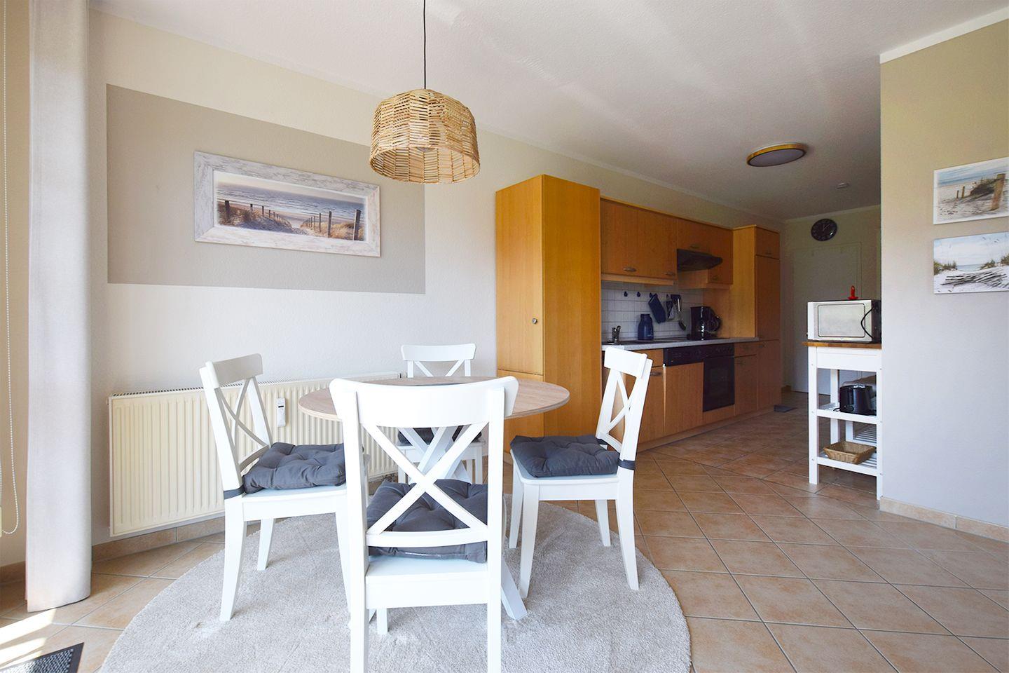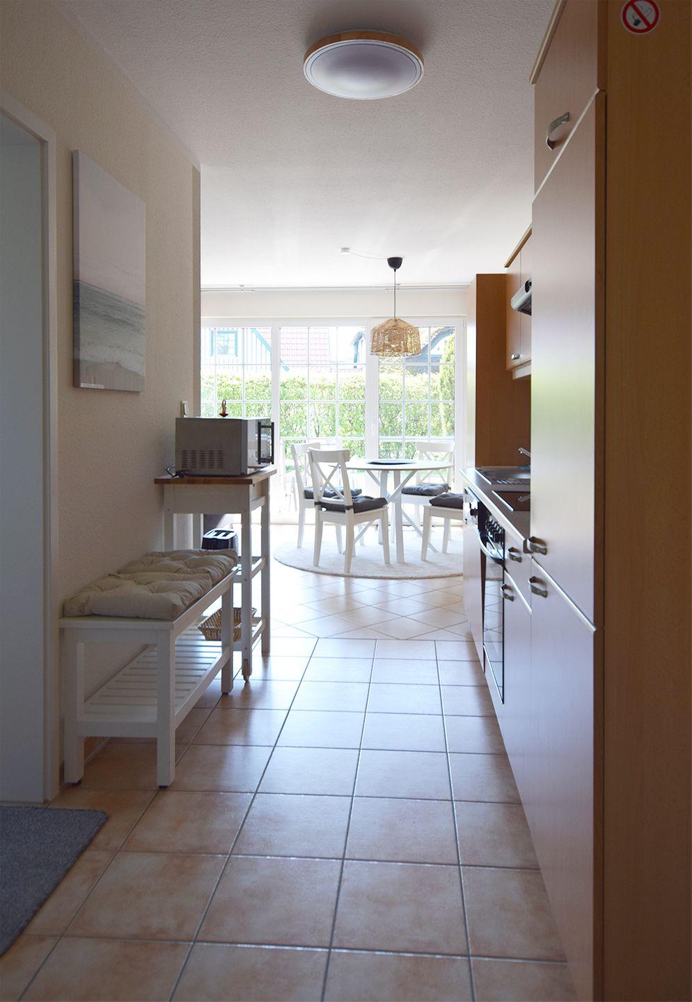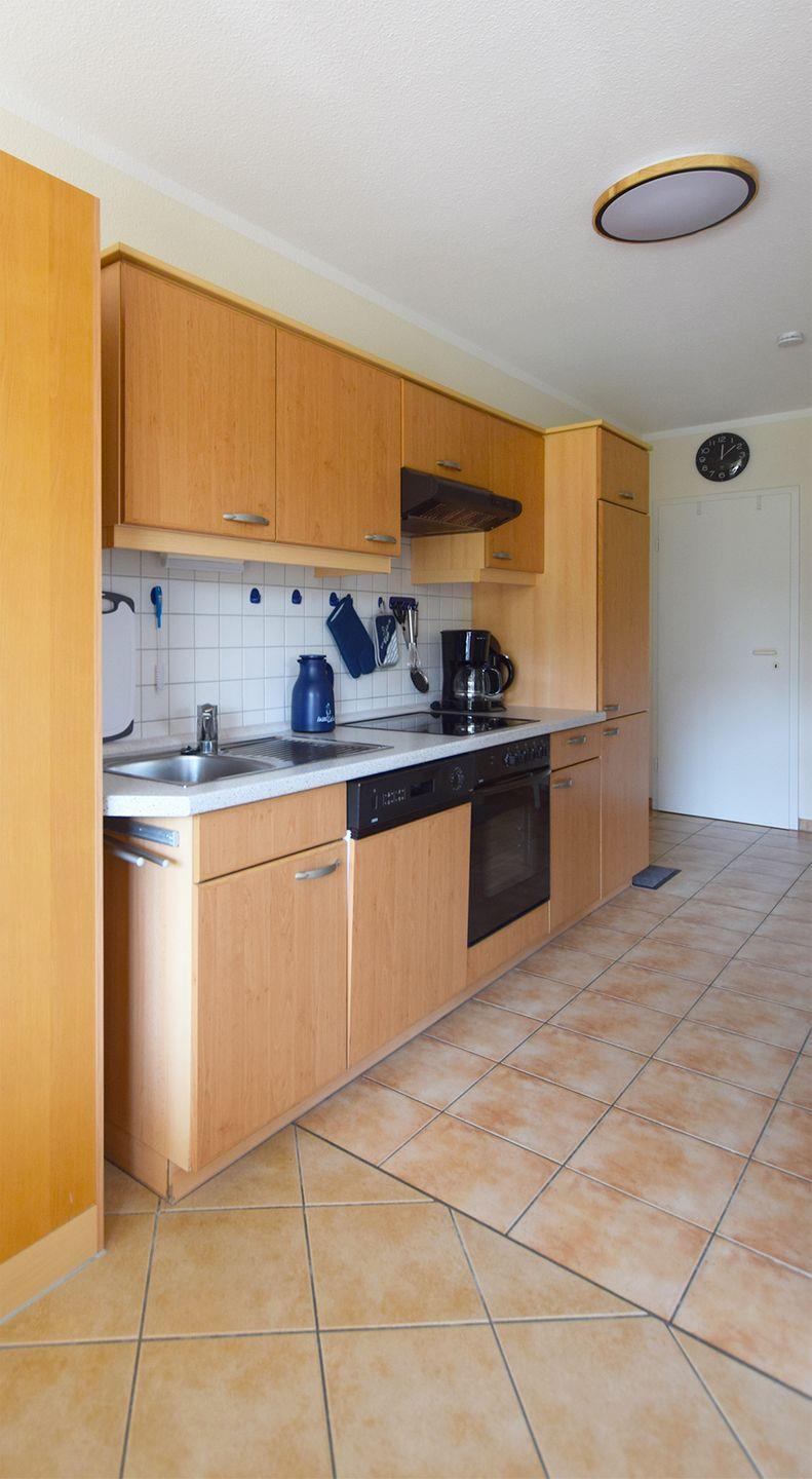 Diese gemütliche Ferienwohnung für bis zu 4 Personen bietet auf ca. 52 m² eine komfortable Unterkunft im Erdgeschoss. Der Wohnbereich ist mit einer Sitzgarnitur, einem Esstisch, einem Radio mit CD/DVD-Player und einem TV (SAT/Kabel) ausgestattet. Die moderne Einbauküche ist ideal für Selbstversorger und verfügt über einen Herd, Backofen, Geschirrspüler, Mikrowelle, Kühlschrank mit Gefrierfach, Kaffeemaschine, Toaster und Wasserkocher. Das Badezimmer ist mit einer Dusche, einem WC und einer Waschmaschine ausgestattet.