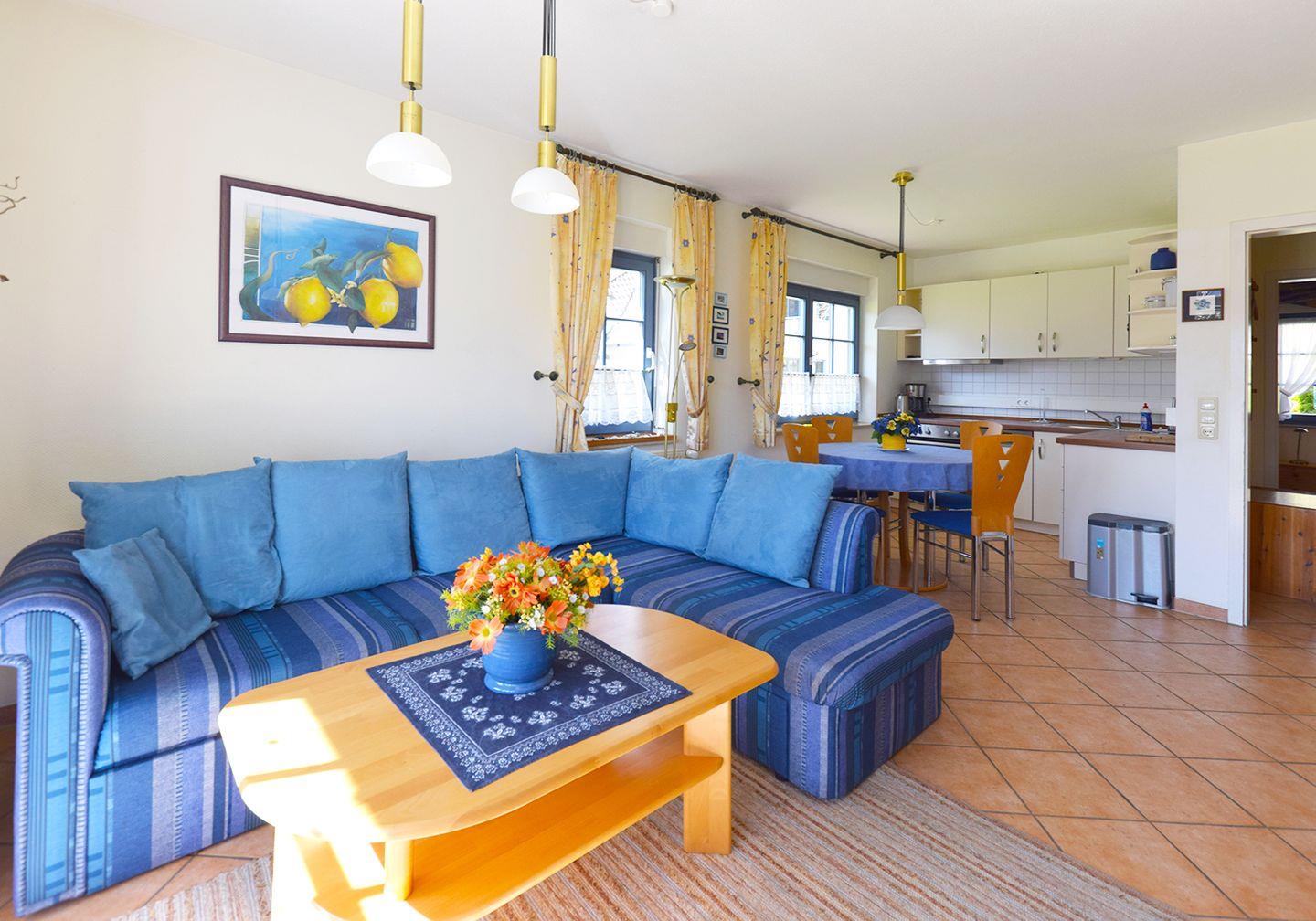 Die Ferienwohnung für bis zu 4 Personen bietet auf ca. 45 m² eine komfortable und gut ausgestattete Unterkunft. Im Erdgeschoss befindet sich der Wohnbereich mit einem Esstisch, einem Schlafsofa, einem Radio mit CD-Player sowie einem TV mit SAT/Kabel. Die offene Einbauküche ist komplett ausgestattet mit einem Backofen, Geschirrspüler, Herd, Kaffeemaschine, Kühlschrank mit Gefrierfach, Mikrowelle und Wasserkocher – ideal für die Zubereitung eigener Mahlzeiten. Das Badezimmer ist mit einer Dusche, WC und Waschbecken ausgestattet.
