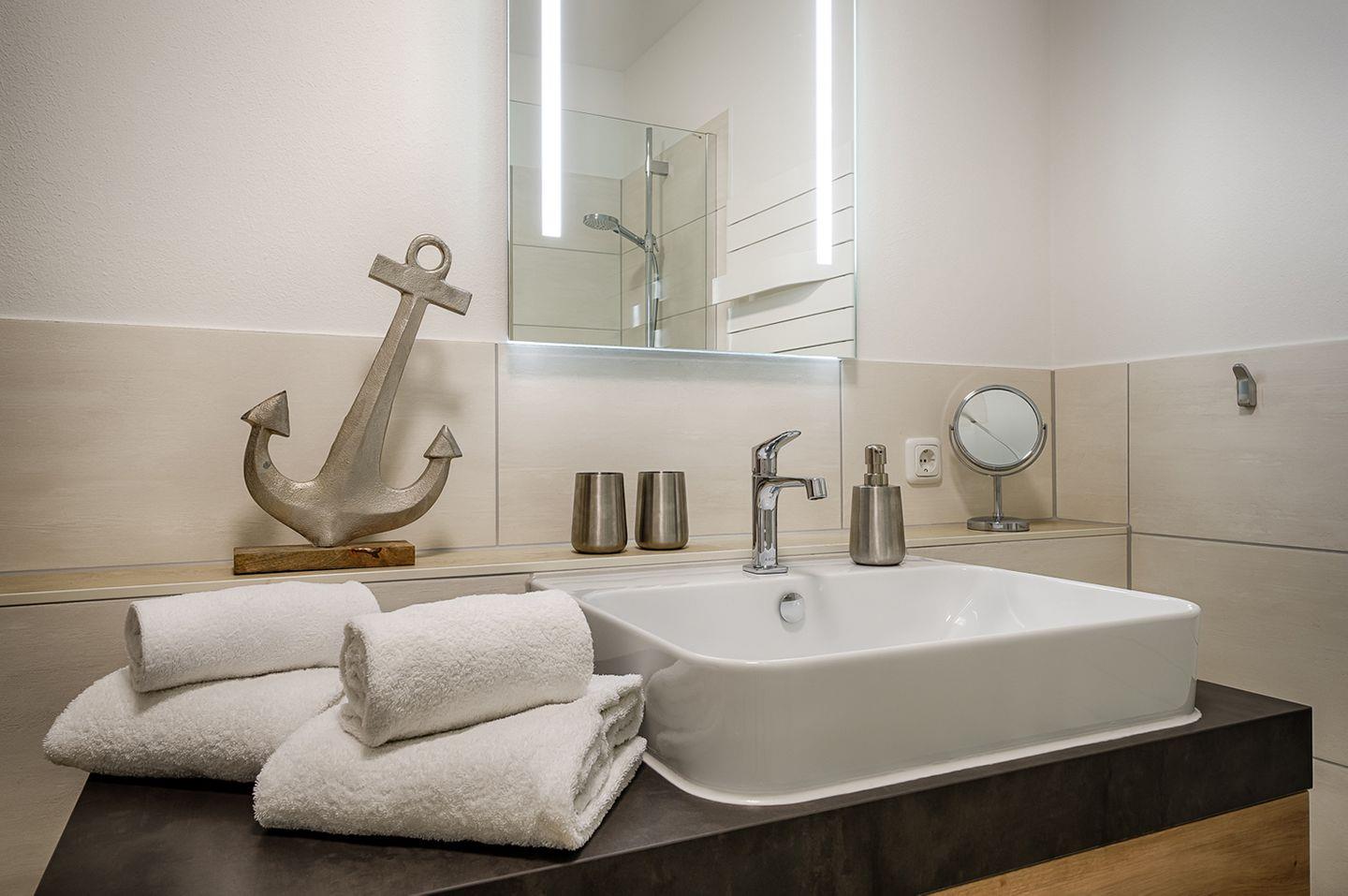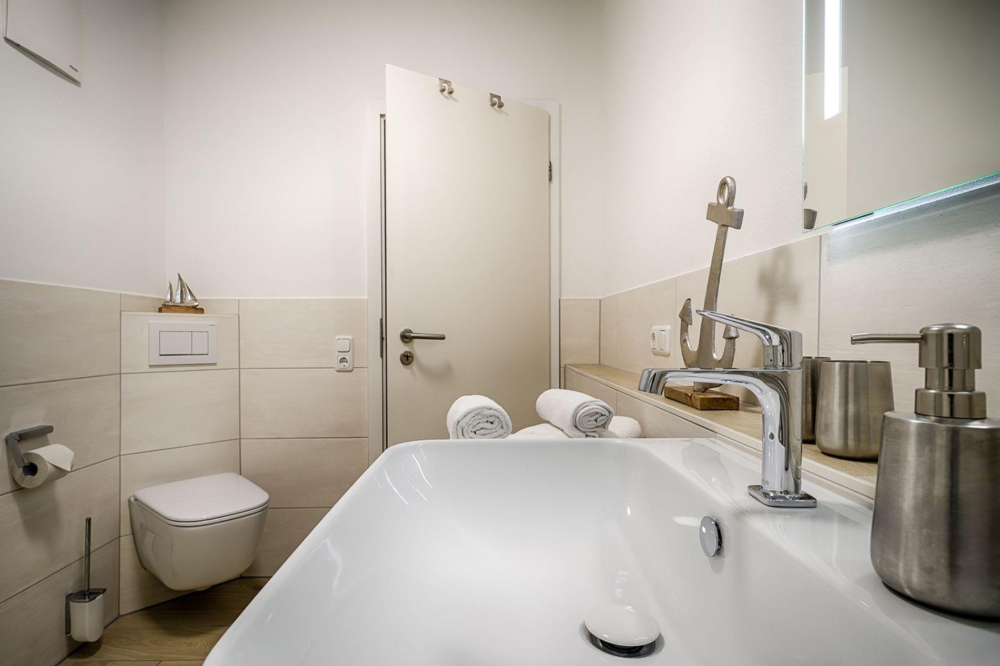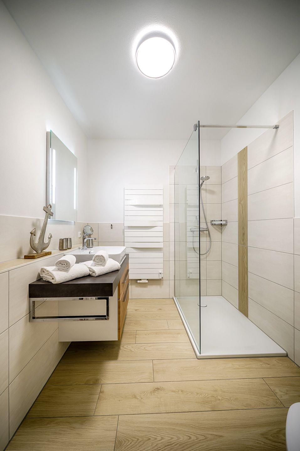 Das Bad ist mit einer bodengleichen Dusche, WC und Waschbecken ausgestattet.