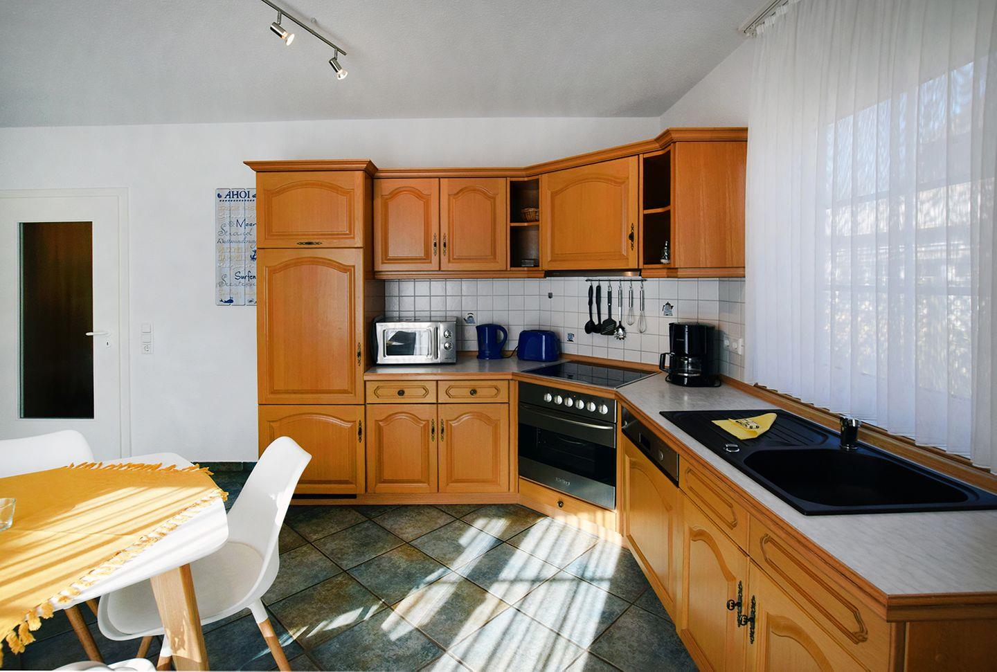Die gut ausgestattete Einbauküche bietet Ihnen alles, was Sie zur Zubereitung Ihrer Mahlzeiten benötigen: Backofen, Geschirrspüler, Herd, Kaffeemaschine, Kühlschrank (ohne Tiefkühlfach), Mikrowelle, Toaster und Wasserkocher. Das Badezimmer verfügt über eine Dusche, ein WC und eine Waschmaschine.