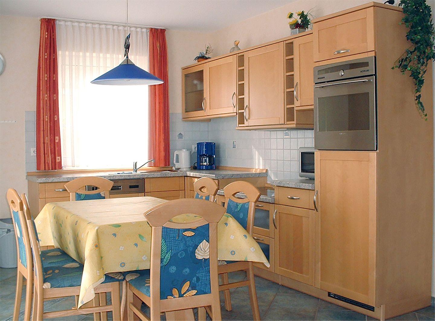 Ferienwohnung bis 4 Personen | ca. 63 m² Wohnfläche | EG Wohnbereich mit Einbauküche, Bad, 2 Schlafzimmer | Süd-Terrasse | 1 Parkplatz | Wohnbereich Esstisch, Sitzgarnitur, Radio mit CD-Player, TV SAT/Kabel | Einbauküche Backofen, Geschirrspüler, Herd, Kaffeemaschine, Kühlschrank mit Gefrierfach, Mikrowelle, Toaster, Wasserkocher | Bad Dusche, Waschmaschine, WC | 2 Schlafzimmer. 1 Doppelbett (180 x 200 cm Einzelmatratze), 2 Einzelbetten (80 x 200 cm) jeweils mit TV | Kinderhochstuhl, Reisebett ohne Bettwäsche | gemeinschaftliche Nutzung von Fahrradschuppen | WLAN