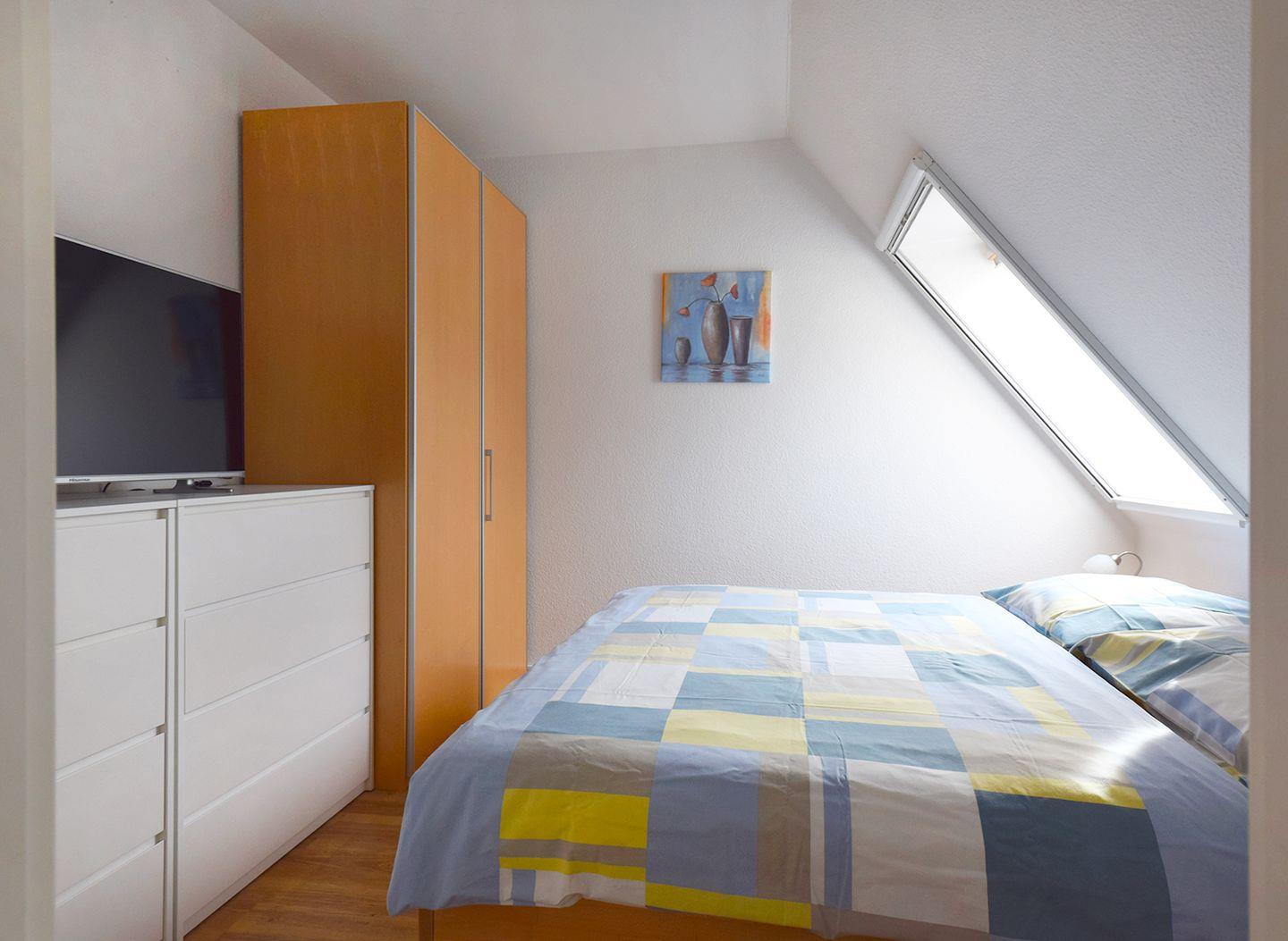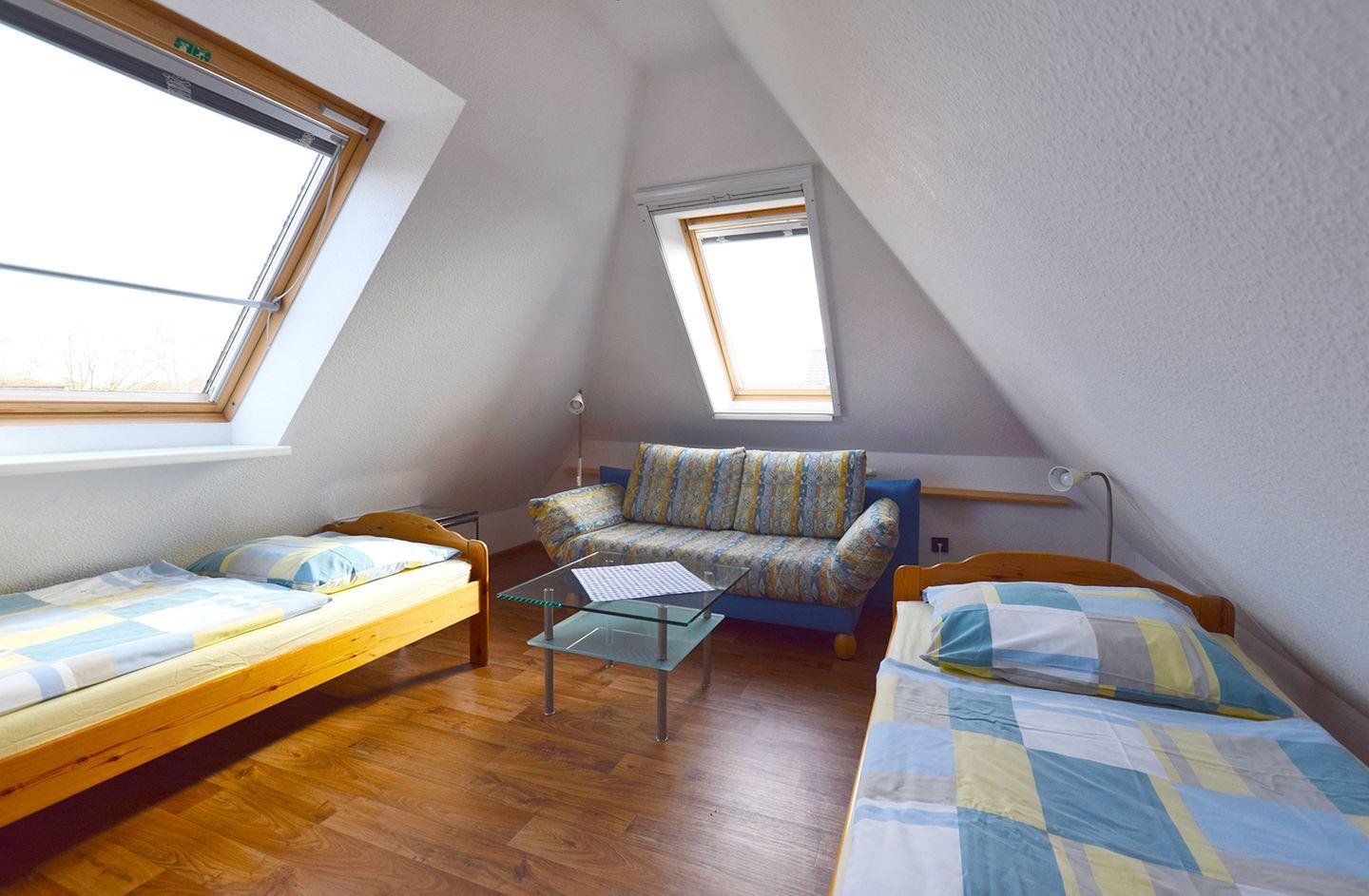 Insgesamt gibt es zwei Schlafzimmer: Das erste mit einem Doppelbett (180 x 200 cm) und SAT-TV befindet sich im Obergeschoss. Über eine Wendeltreppe gelangen Sie ins Dachgeschoss, wo sich das zweite Schlafzimmer mit drei Einzelbetten (je 90 x 200 cm), einem Sofa und einem weiteren SAT-TV befindet. Ein Gäste-WC im DG sorgt für zusätzlichen Komfort.