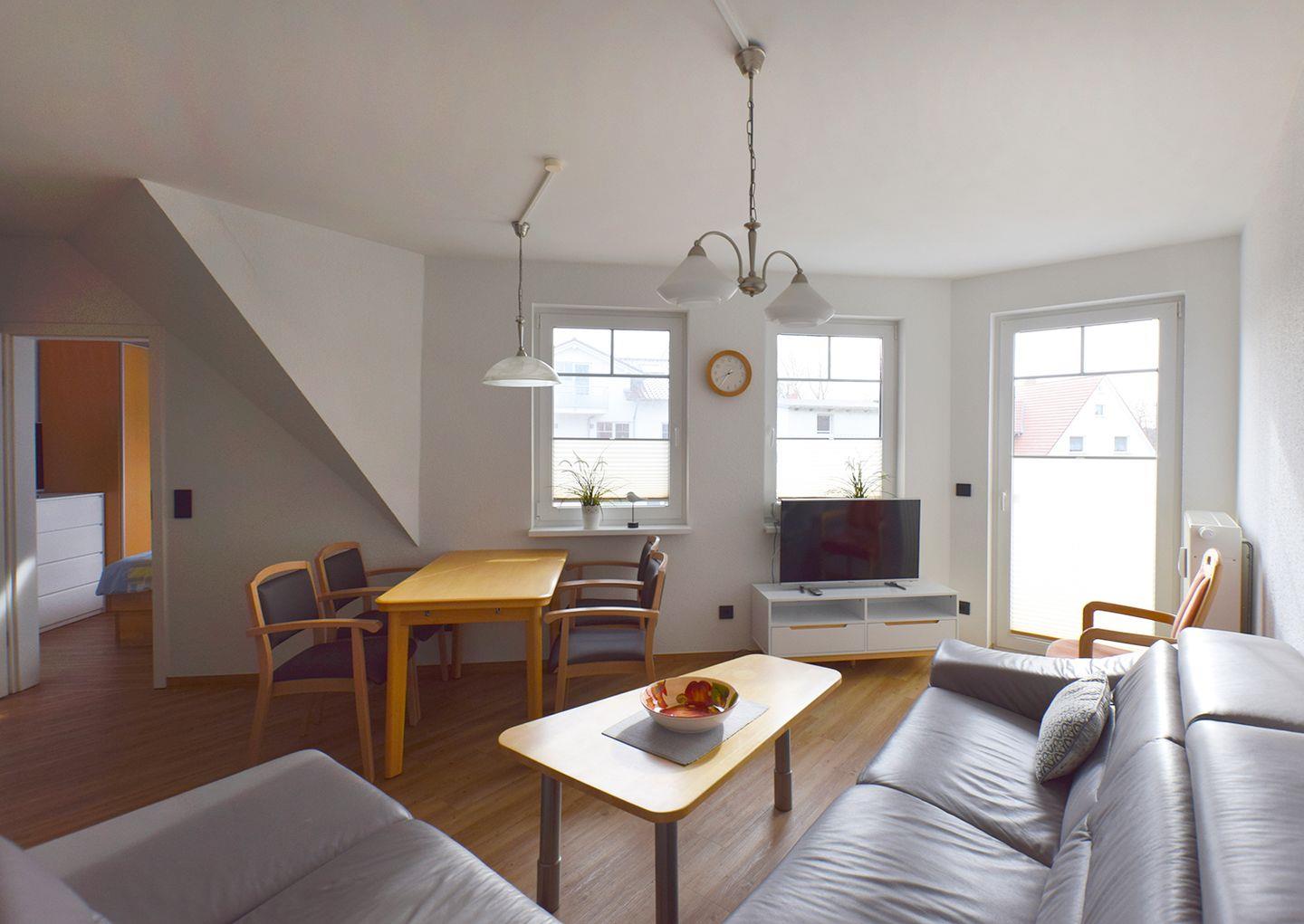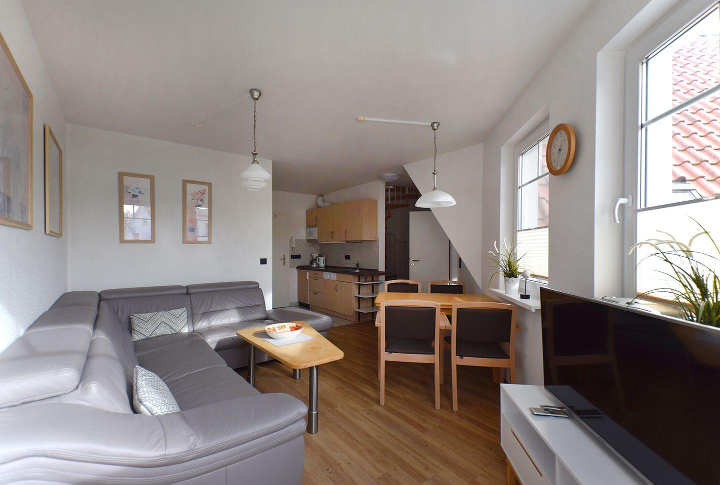 Die gemütliche Ferienwohnung für bis zu 5 Personen bietet auf ca. 59 m² Wohnfläche viel Platz für einen entspannten Aufenthalt. Im Obergeschoss befindet sich der offene Wohn-/Essbereich mit Esstisch, Sitzgarnitur, Radio mit CD und SAT-TV – perfekt für gesellige Stunden.