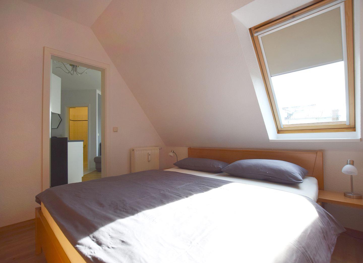 Das erste Schlafzimmer im OG ist mit einem Doppelbett (160 x 200 cm, durchgehende Matratze) ausgestattet. Im Dachgeschoss, das über eine Wendeltreppe erreichbar ist, befindet sich ein weiteres Schlafzimmer mit 3 Einzelbetten (je 90 x 200 cm), zwei Sesseln und einem SAT-TV. Zusätzlich gibt es im DG ein Gäste-WC.