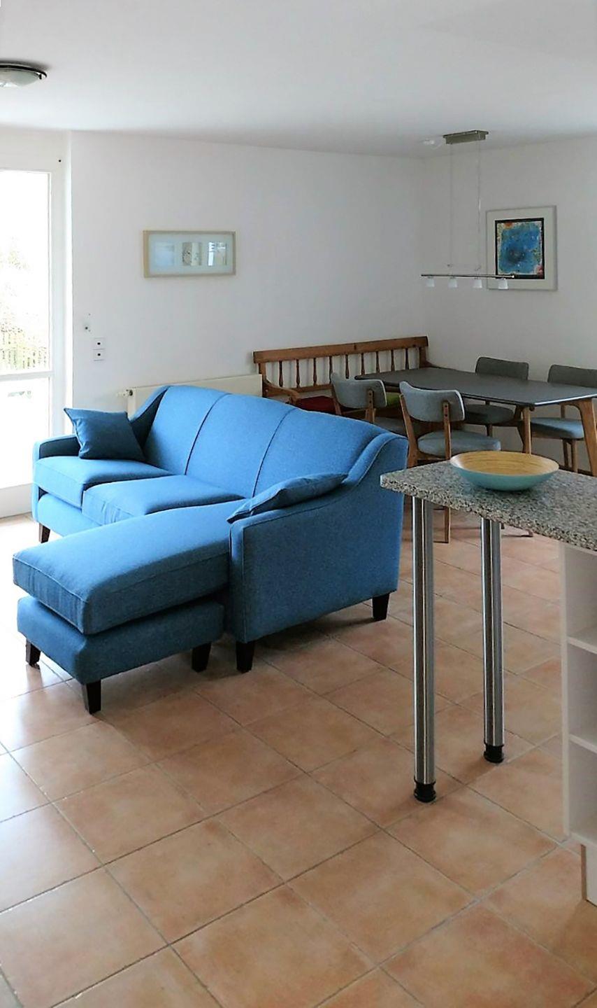 Die großzügige Ferienwohnung für bis zu 4 Personen bietet auf ca. 75 m² Wohnfläche im Erdgeschoss ein gemütliches Ambiente für Ihren Aufenthalt. Der offene Wohn-/Essbereich ist mit einer modernen Sitzecke und einem Kaminofen ausgestattet, der für eine behagliche Atmosphäre sorgt. Hier finden Sie auch einen Esstisch, ein Radio mit CD-Player und einen TV mit SAT/Kabel.