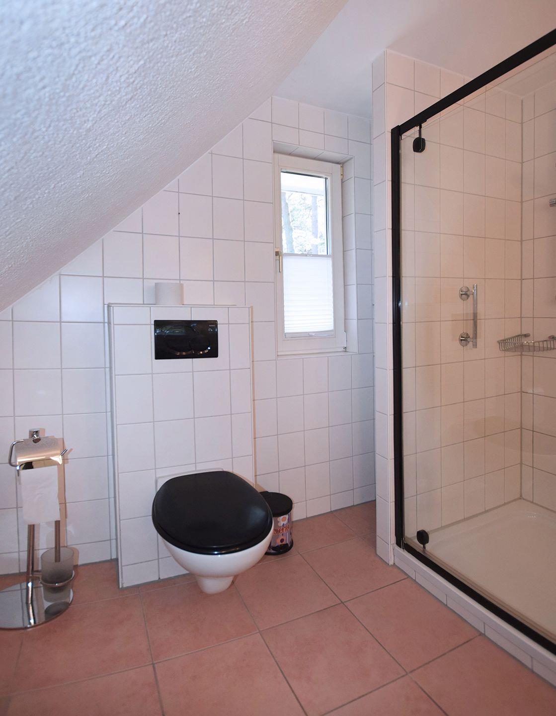 Im Obergeschoss gibt es ein weiteres Badezimmer mit Dusche und WC sowie zwei Schlafzimmer: Eines mit einem Doppelbett (180 x 200 cm) und SAT-TV und ein weiteres mit zwei Einzelbetten (90 x 200 cm).