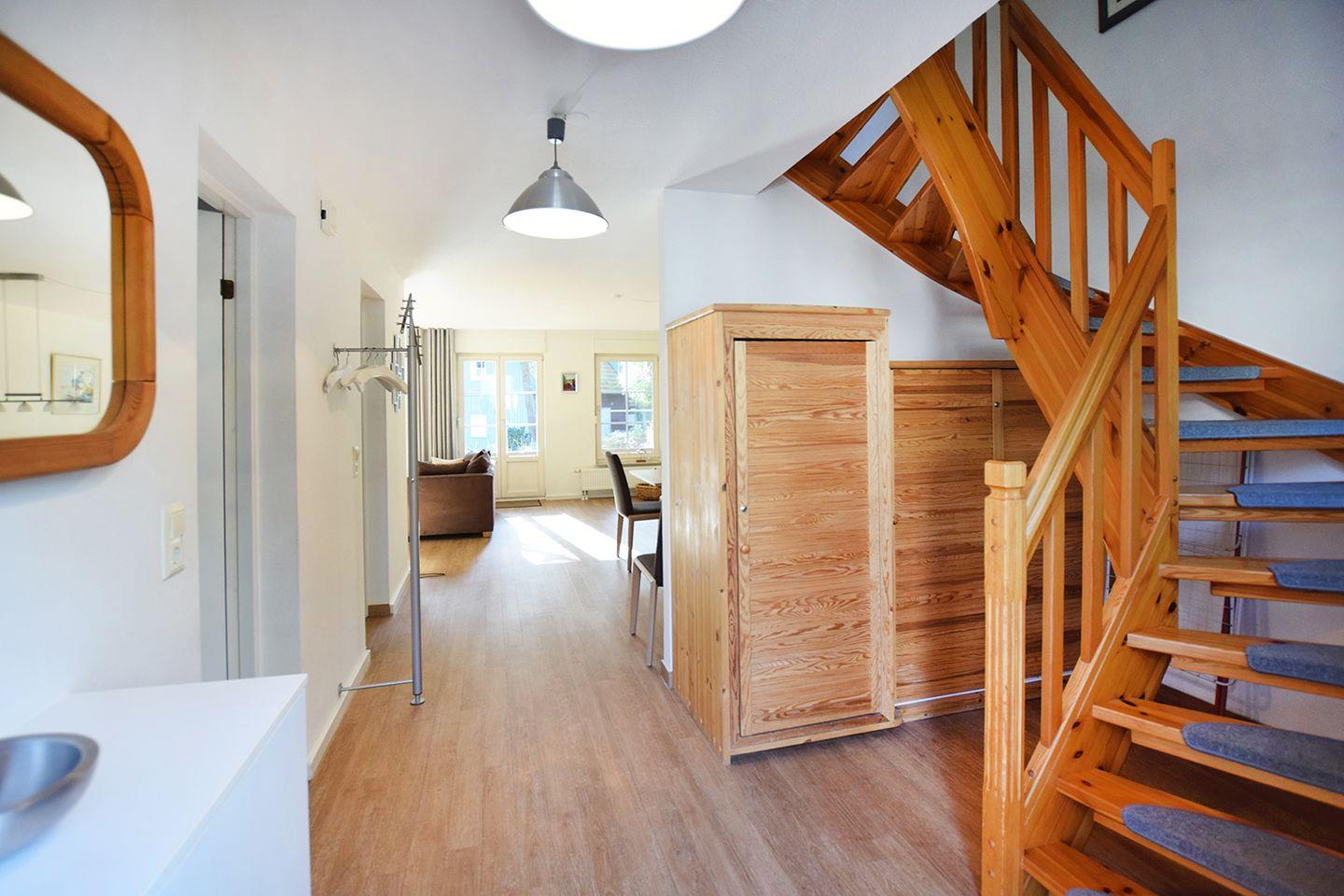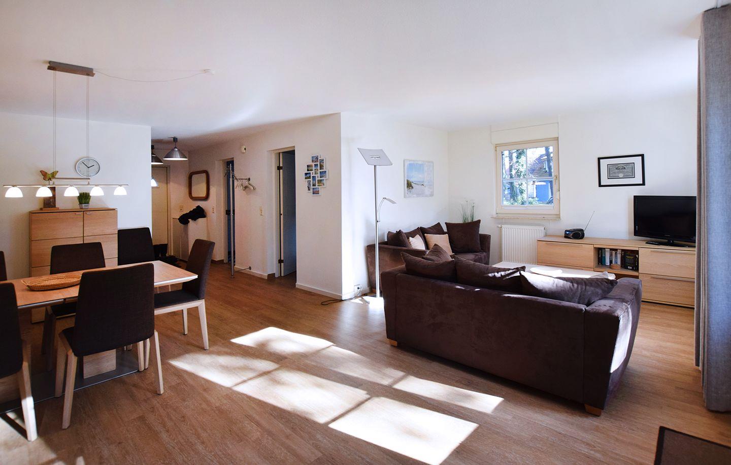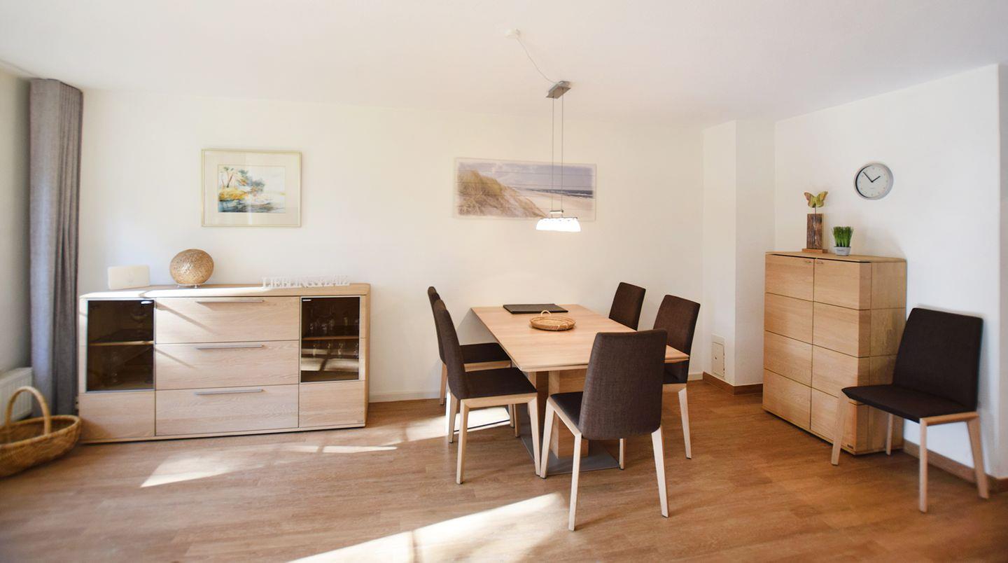 Diese gemütliche Ferienhaushälfte bietet auf ca. 100 m² Wohnfläche Platz für bis zu 6 Personen und ist ideal für Familien oder Gruppen, die einen entspannten Aufenthalt suchen. Im Erdgeschoss befindet sich ein großzügiger Wohn-/Essbereich mit Esstisch, Sitzecke, Radio und SAT-TV.