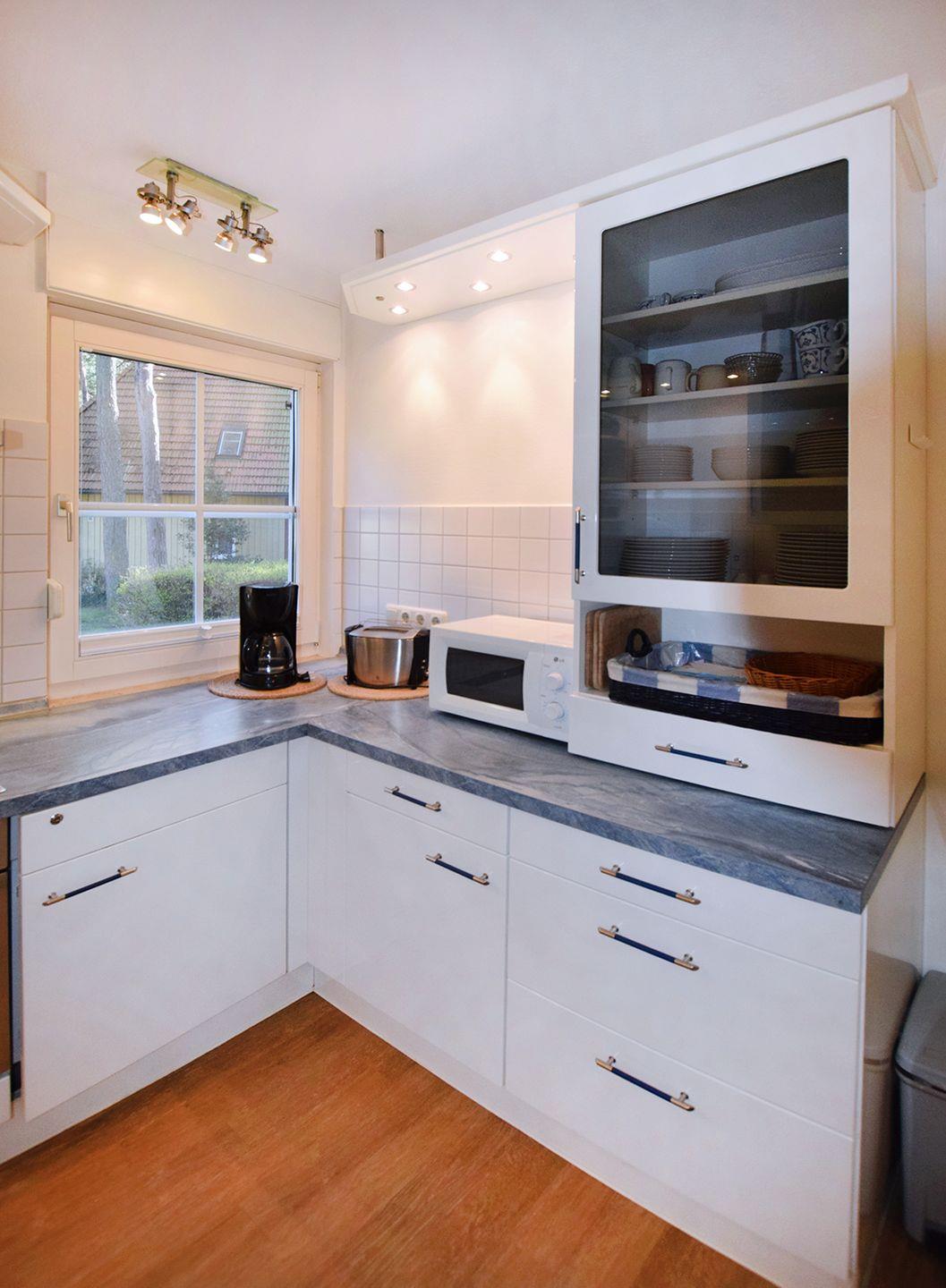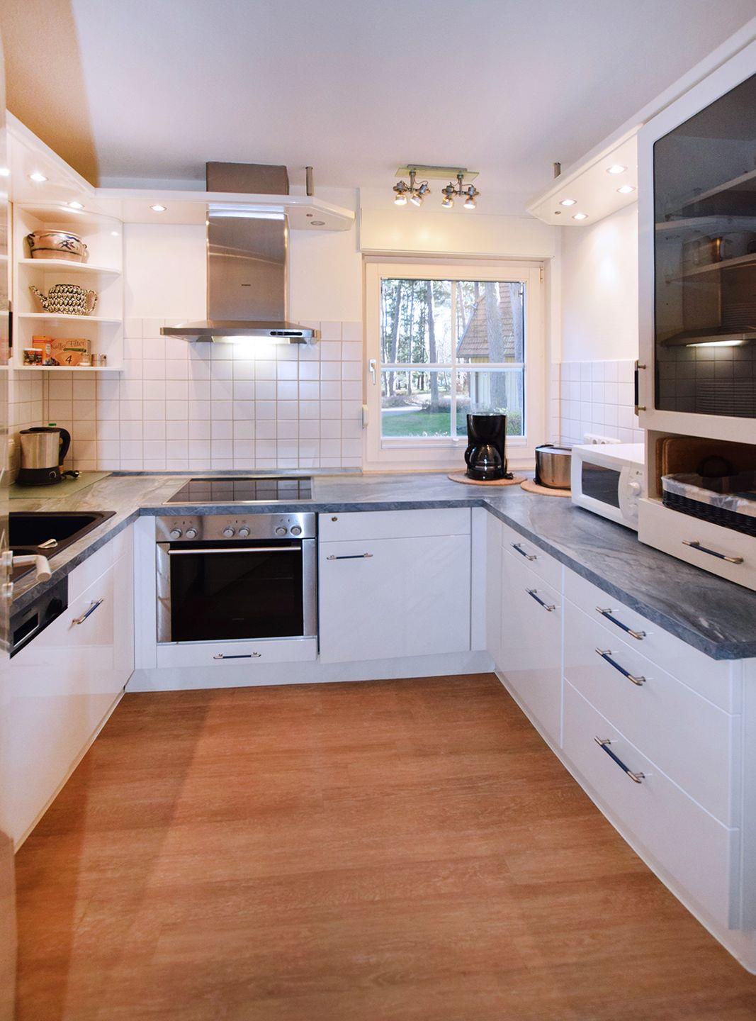 Die gut ausgestattete Küche verfügt über einen Backofen, Gefrierschrank, Geschirrspüler, Herd (Cerankochfeld), Kaffeemaschine, Kühlschrank mit Gefrierfach, Mikrowelle, Toaster, Wasserkocher und eine Waschmaschine. Ein Badezimmer mit Dusche und WC rundet das Erdgeschoss ab.