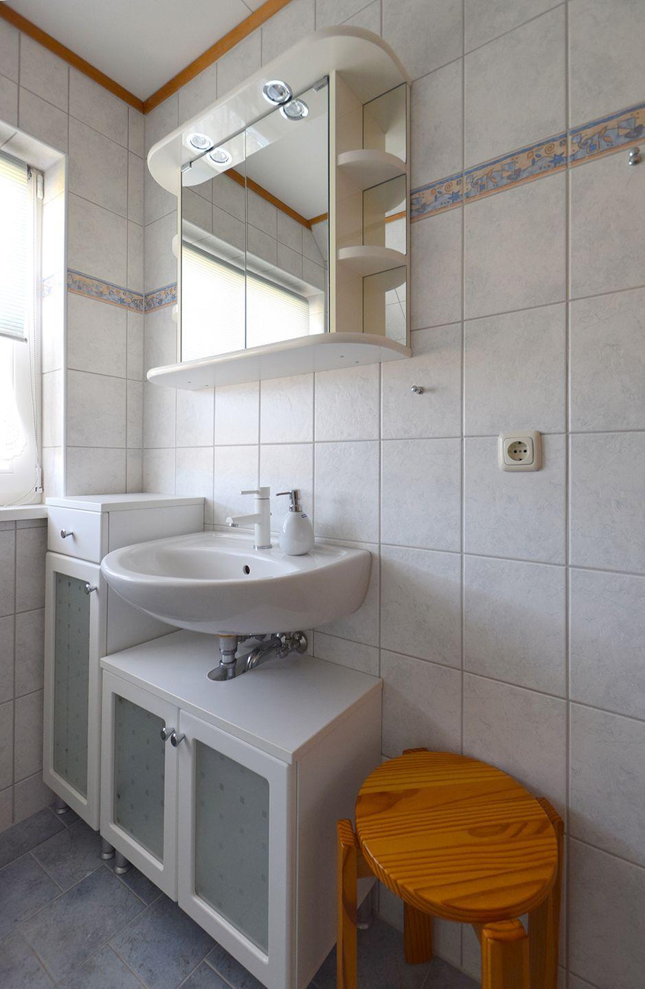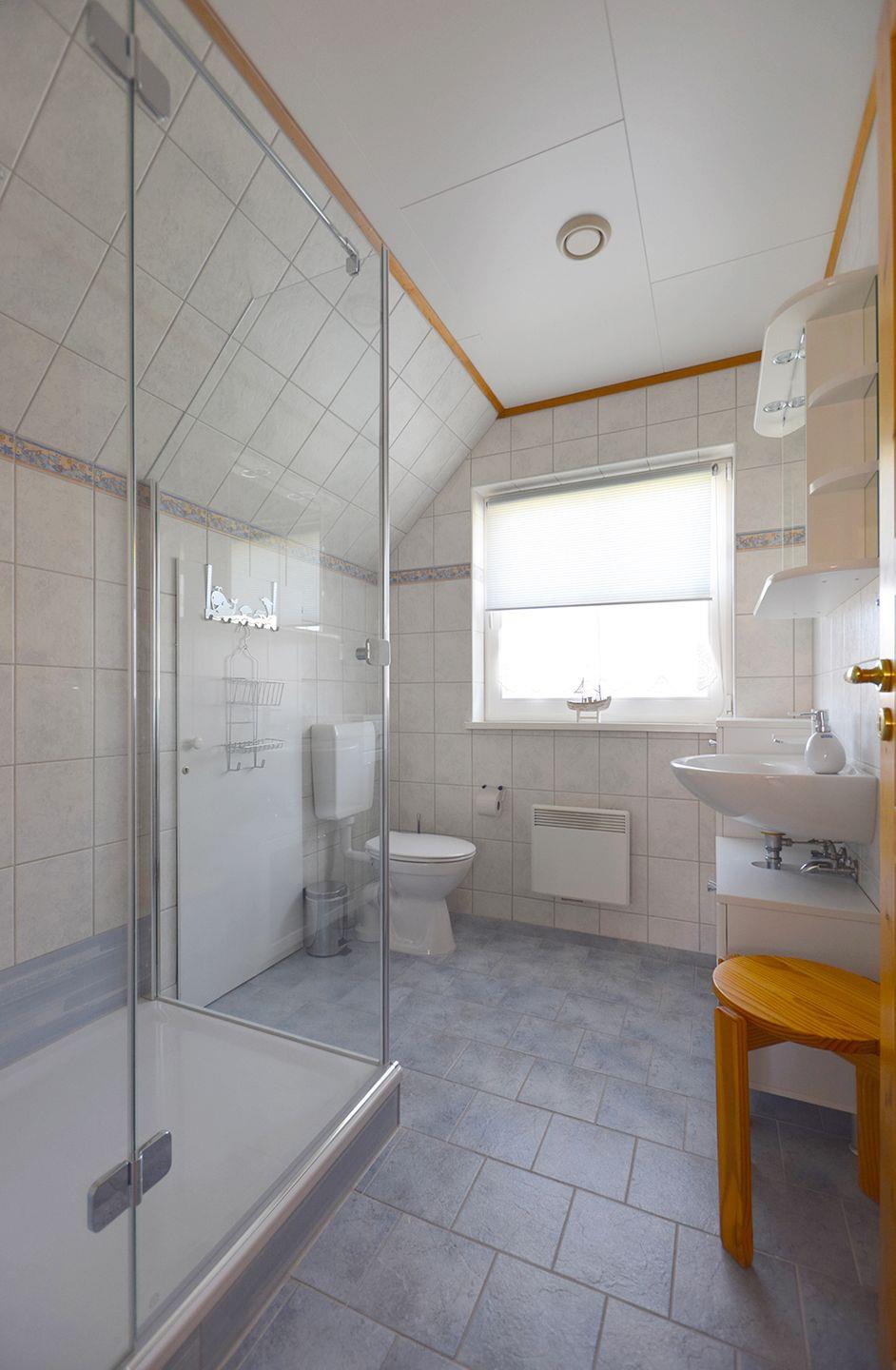 Im Obergeschoss befinden sich zwei Schlafzimmer. Das erste Schlafzimmer bietet ein Doppelbett (160 x 200 cm), ein Einzelbett (90 x 200 cm) sowie ein Babybett, perfekt für Familien mit kleinen Kindern. Das zweite Schlafzimmer ist mit einem kleineren Doppelbett (140 x 200 cm) ausgestattet. Beide Schlafzimmer bieten ausreichend Stauraum und eine gemütliche Atmosphäre für einen erholsamen Schlaf. Im Obergeschoss finden Sie außerdem ein Tageslichtbad mit Dusche und WC.