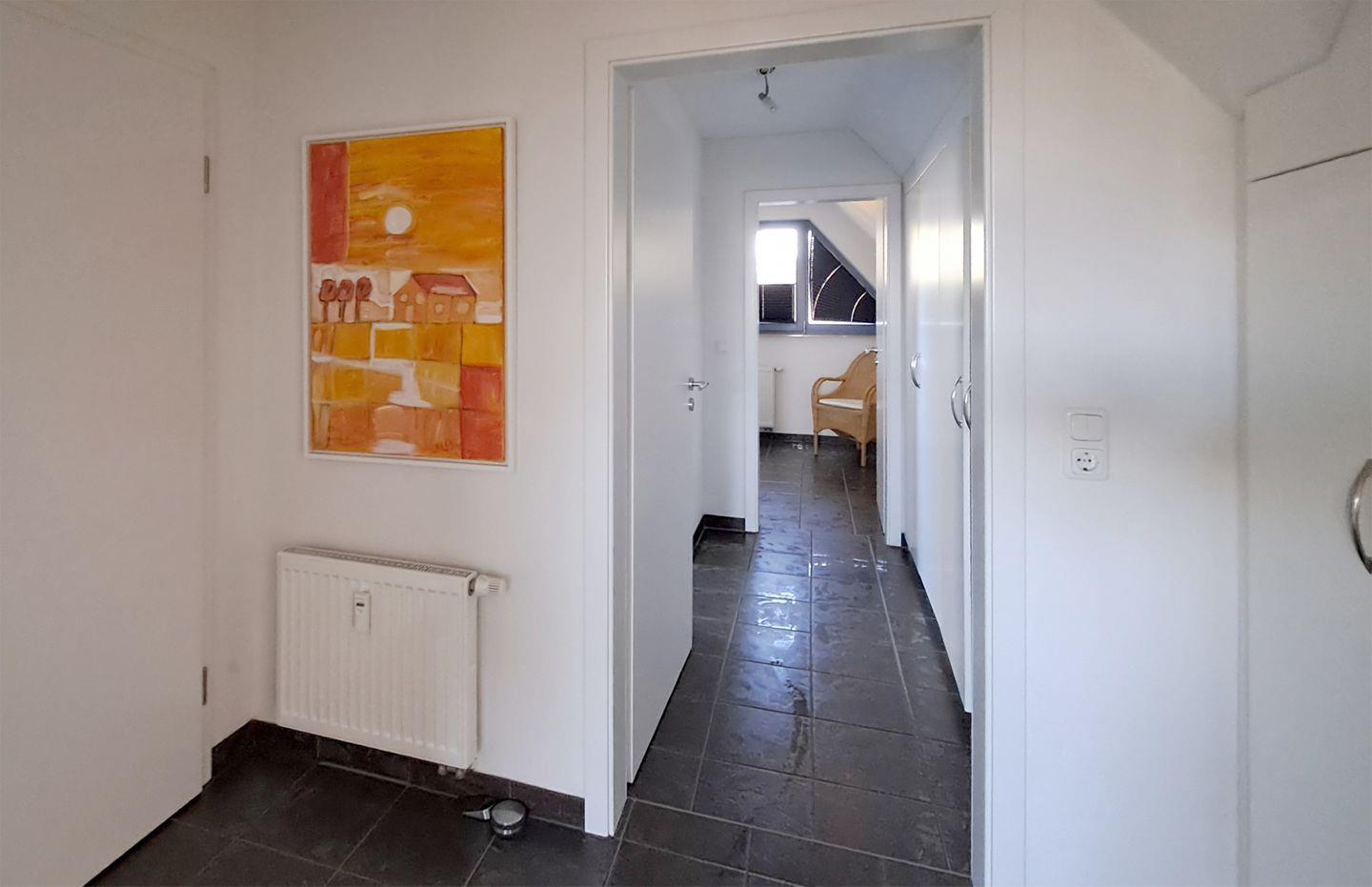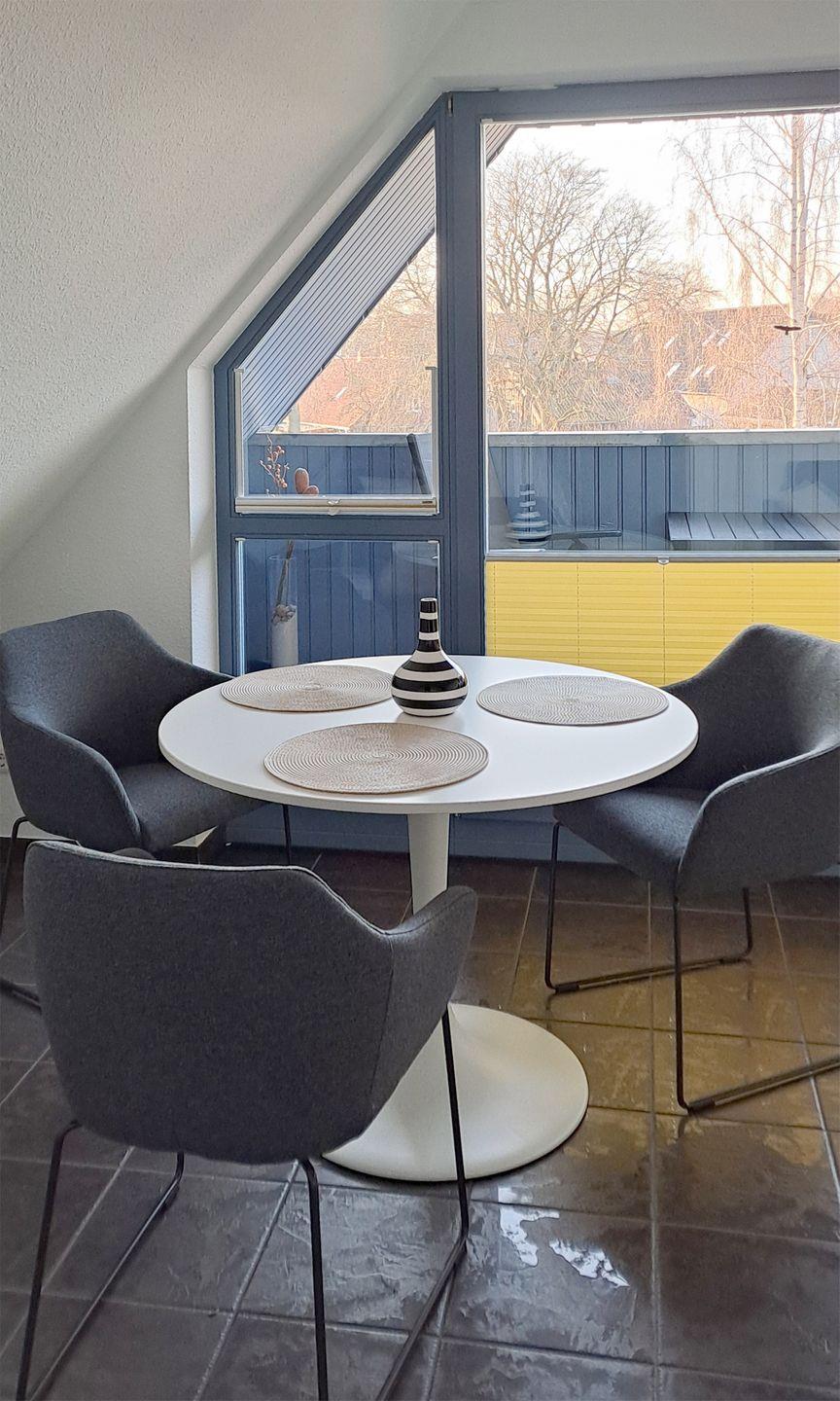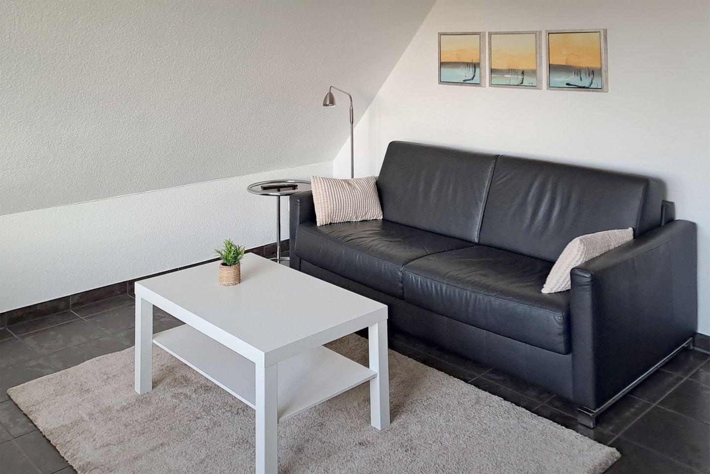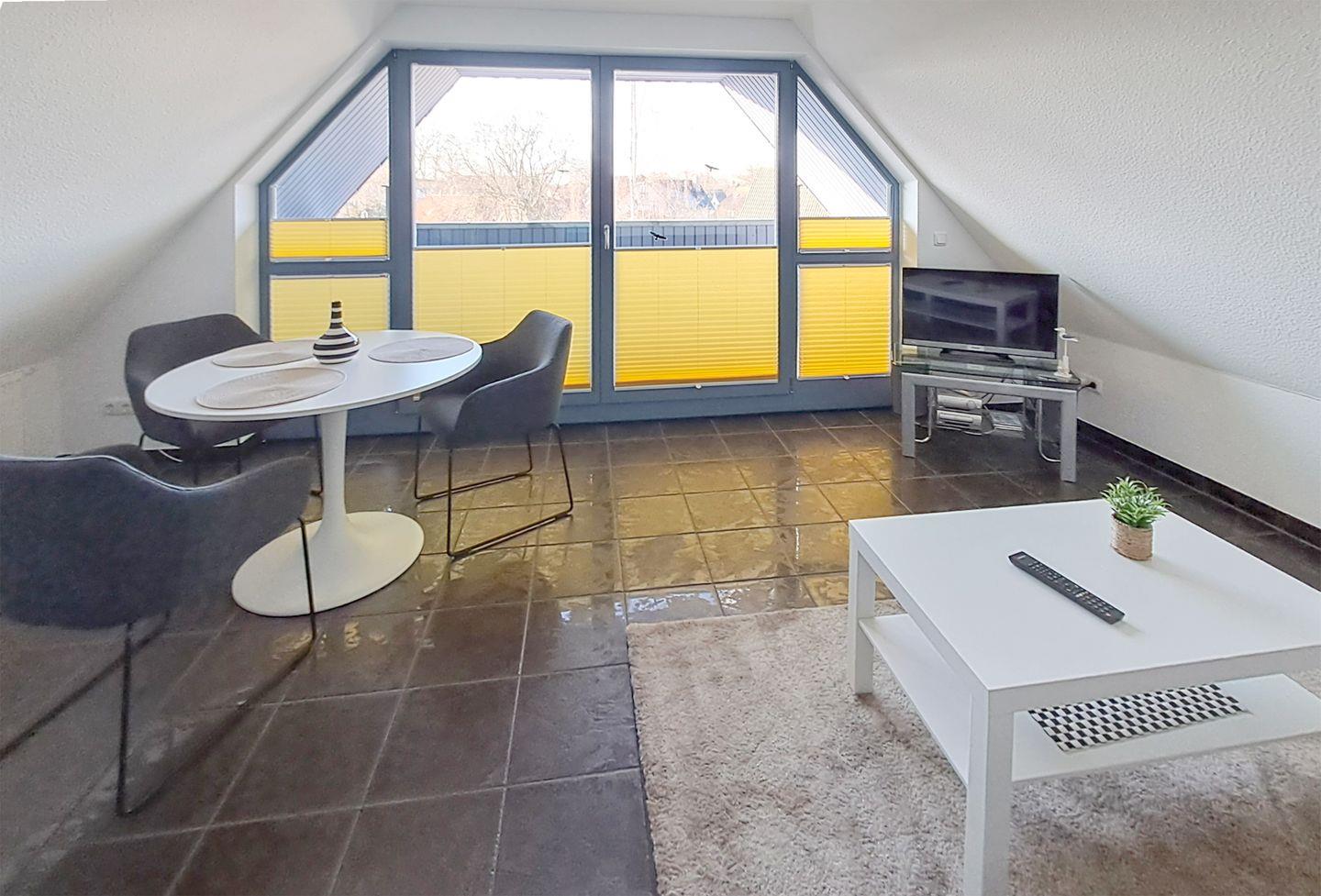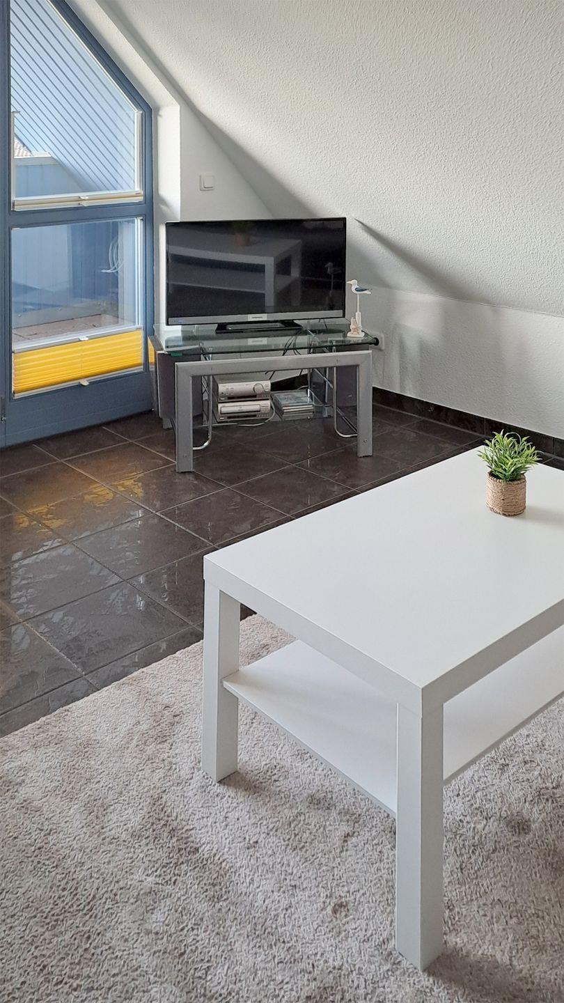 Diese charmante Ferienwohnung für bis zu 3 Personen bietet auf ca. 52 m² Wohnfläche eine gemütliche und gut ausgestattete Unterkunft. Sie befindet sich im Dachgeschoss und besteht aus einem einladenden Wohnbereich, einer gut ausgestatteten Einbauküche, einem Flur, einem Badezimmer und einem Schlafzimmer.