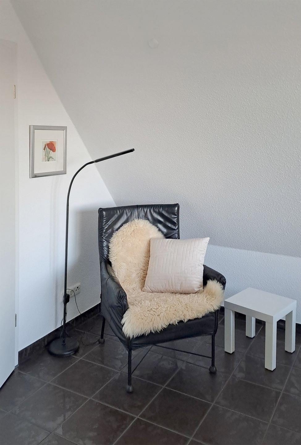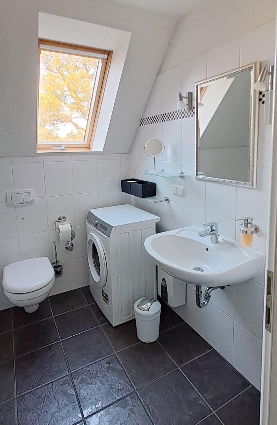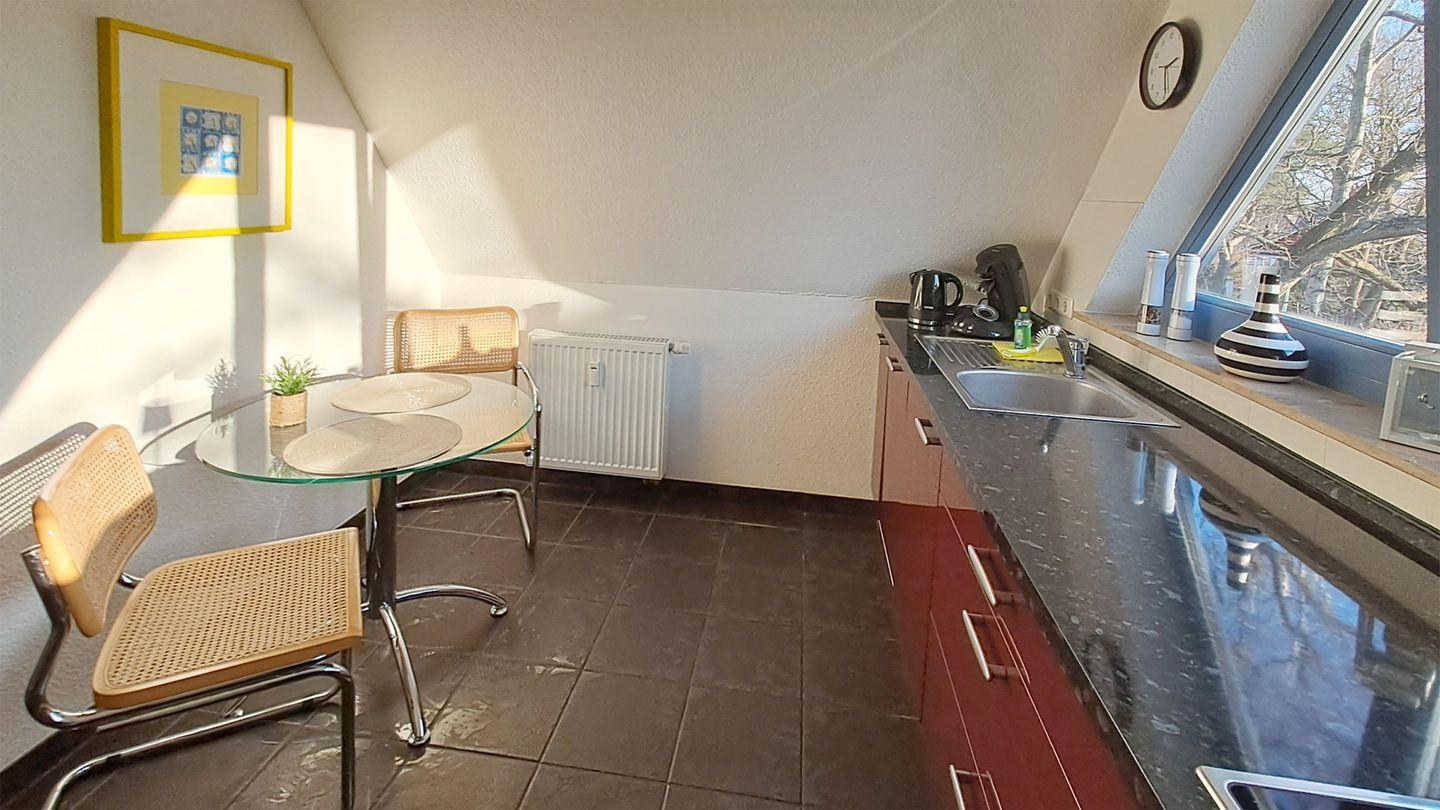 Ferienwohnung bis 3 Personen | ca. 52 m² Wohnfläche | DG Wohnbereich, Einbauküche, Flur, Bad, 1 Schlafzimmer | West-Loggia | 1 Parkplatz | Wohnbereich Schlafsofa, Tisch mit Korbstühlen, Radio mit CD-Player, TV SAT/Kabel | Küchenzeile Backofen, Esstisch, Geschirrspüler, Herd/Cerankochfeld, Kaffeemaschine, Kühlschrank mit Gefrierfach, Toaster, Wasserkocher | Bad Badewanne, WC | 1 Schlafzimmer 1 Doppelbett (180 x 200 cm), 1 Einzelbett (90 x 200 cm) | Bettwäsche kann für 12 € und Handtücher für 8 € pro Person gemietet werden, Fahrradschuppen, Waschmaschine, WLAN