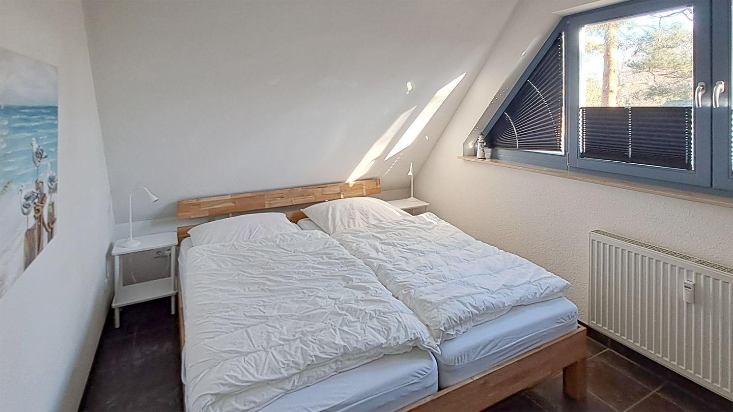 Das Schlafzimmer bietet ein Doppelbett (180 x 200 cm) und ein Einzelbett (90 x 200 cm), das ideal für eine kleine Familie oder Paare mit einem Kind ist.